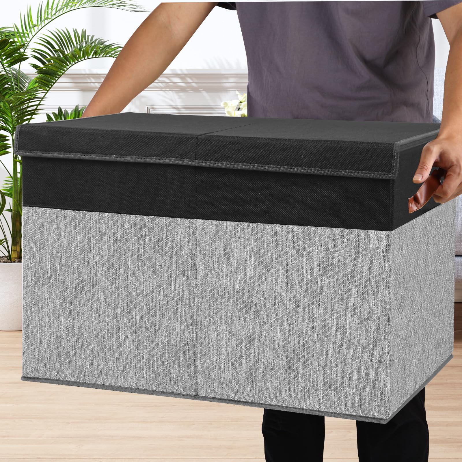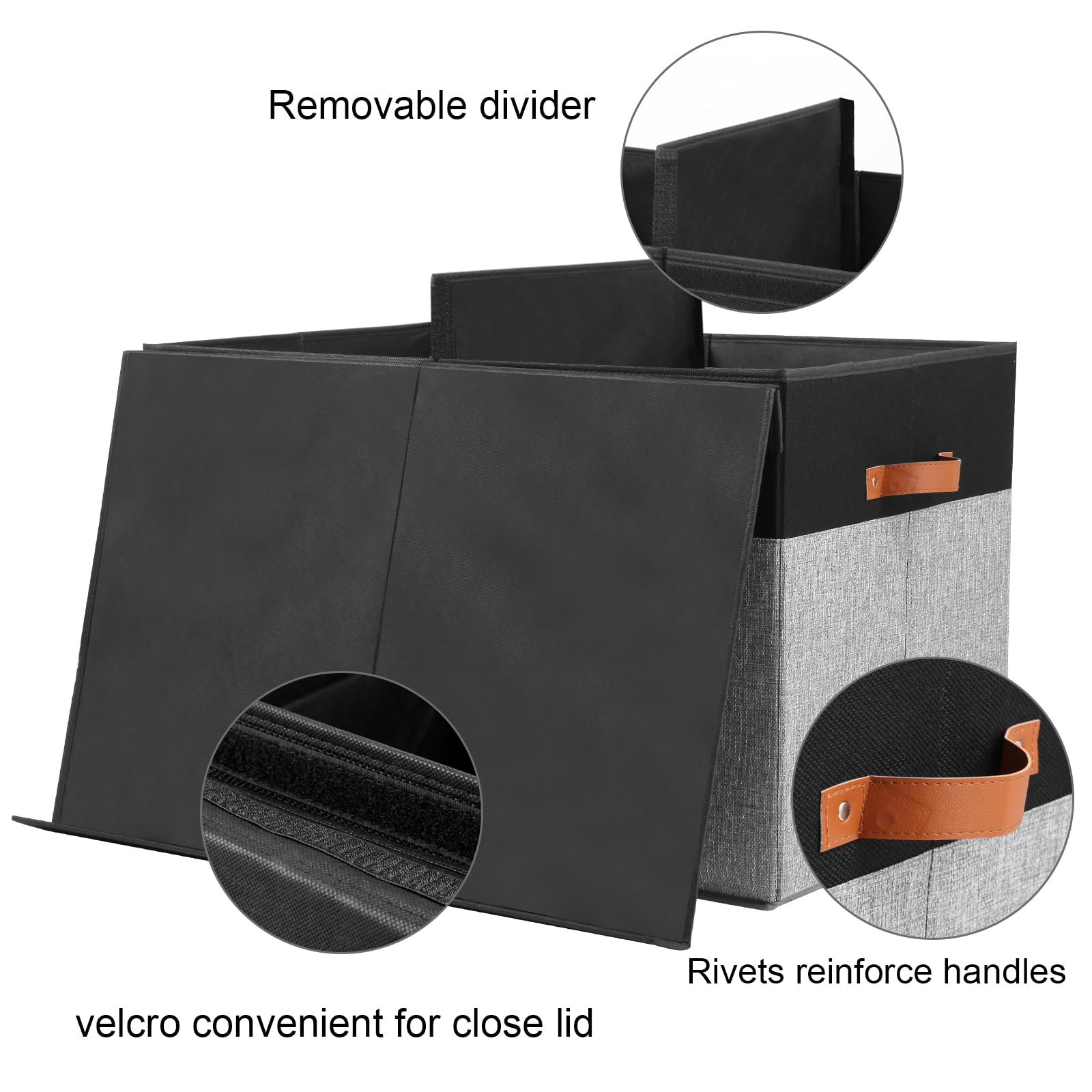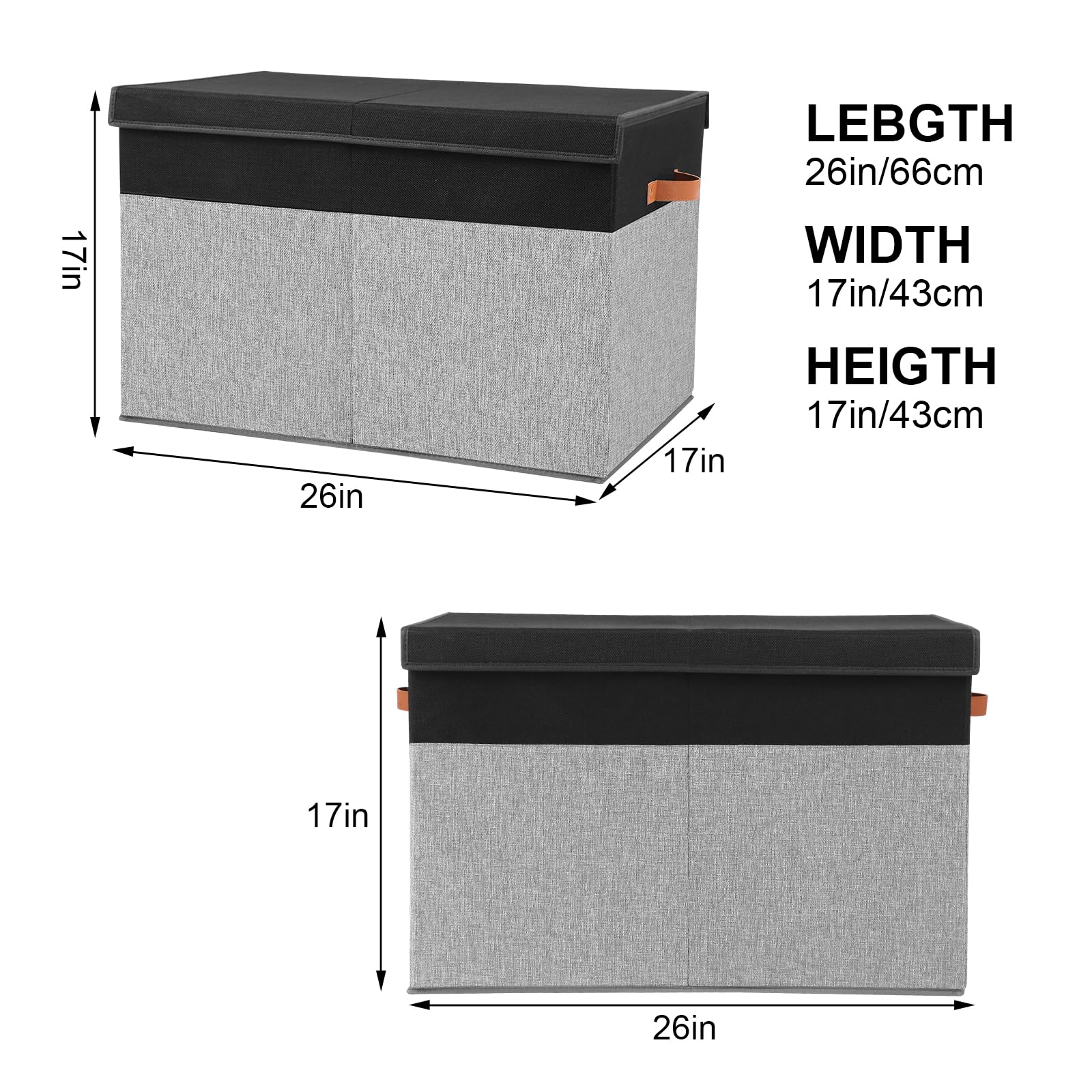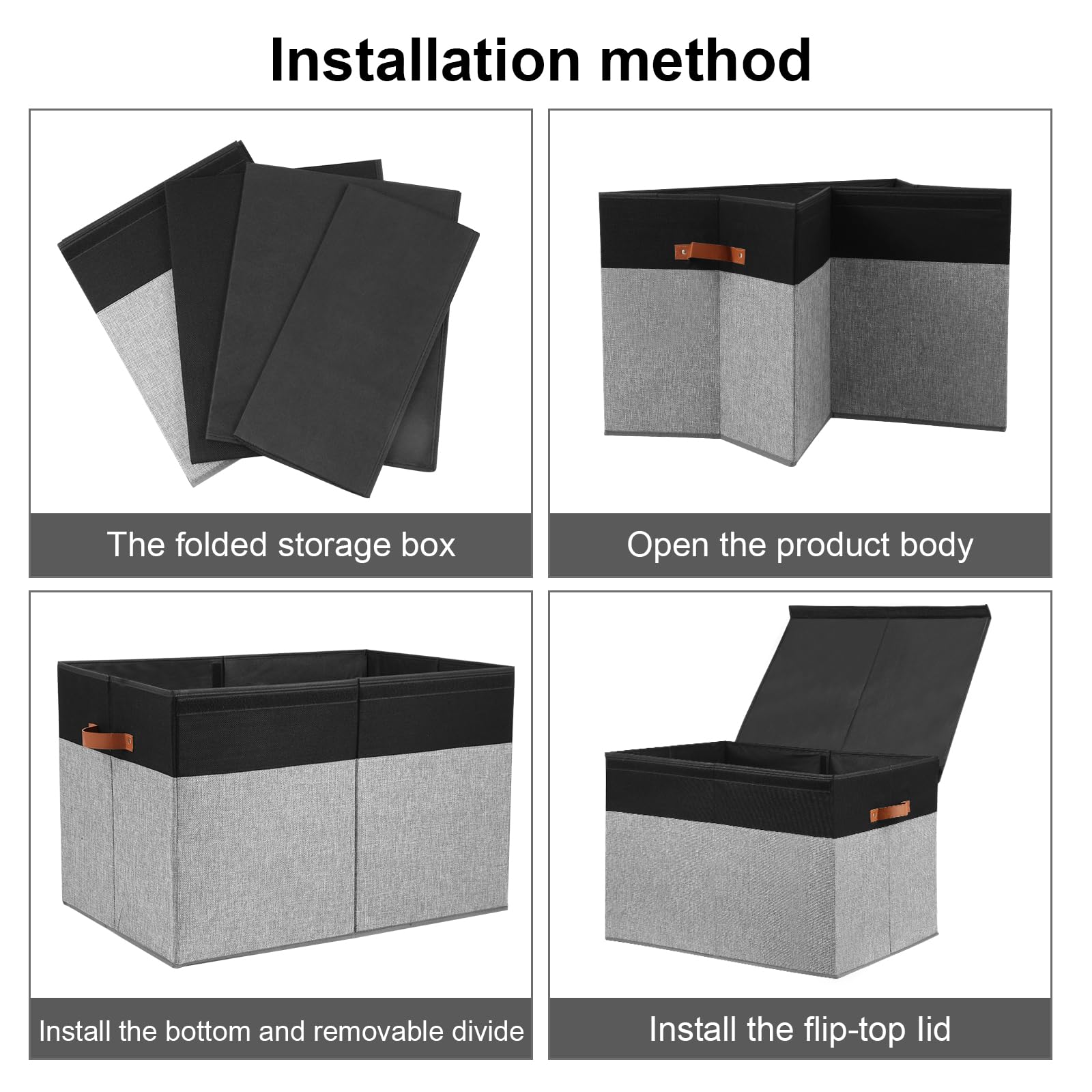 ADVANTAGES: Removable divider board : Great for organizing different items, you can detach the divider for store bigger things Flip-top lid : Keep your items away from dust, open the lid can also be used as an open box Rivets Reinforcement Handles : you can easily carry the large storage basket around your home Collapsible : When not in use, allowing you fold it flat, easy store or carrying Stackable : The toy boxes has a sturdy top, bottom and side, you can stack them SPECIFICATIONS: Color: Black and Grey External material: Polyester linen Upholstery Material: Non-woven fabric Construction Material: Environmentally cardboard Product Size: 26"x17" x17" MULTI-PURPOSES: Closet clothes storage Bathroom sundry storage Shelf organizers Car / vehicle grocery containers Nursery toy storage Bedroom comforters, blankets storage Kitchen & pantry snacks and dry foods storage Office document storage Laundry room cleaning supplies storage ABOUT OUR SERVICES If for any reason you're not completely happy with your purchase, please reach out and we will resolve issues and ensure your contentment.