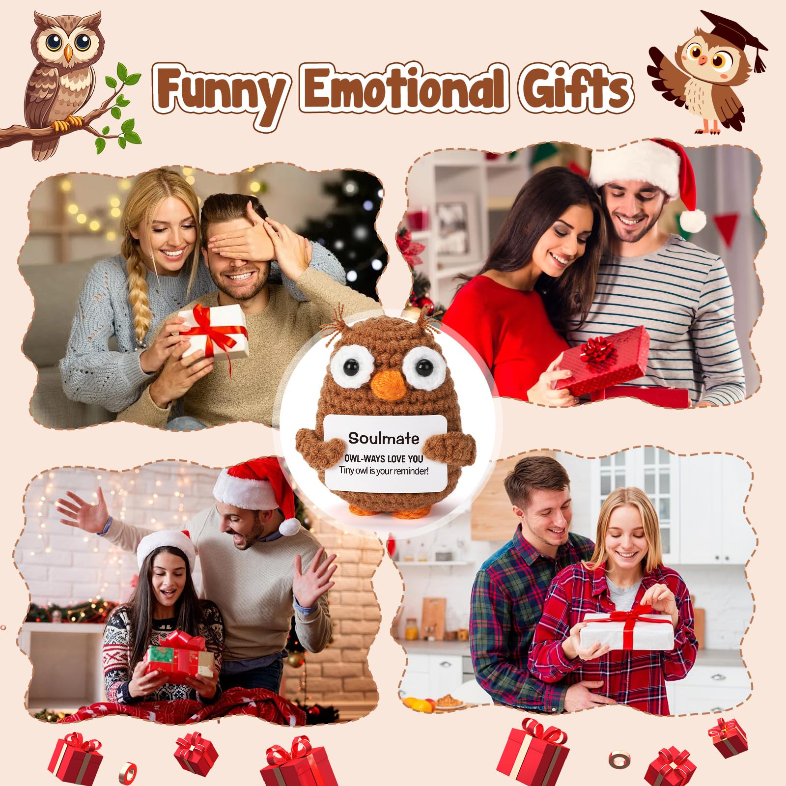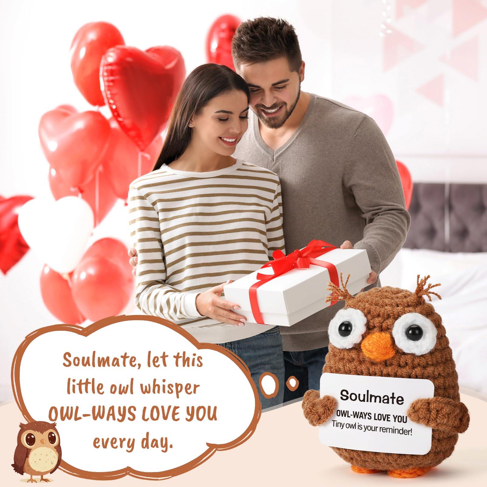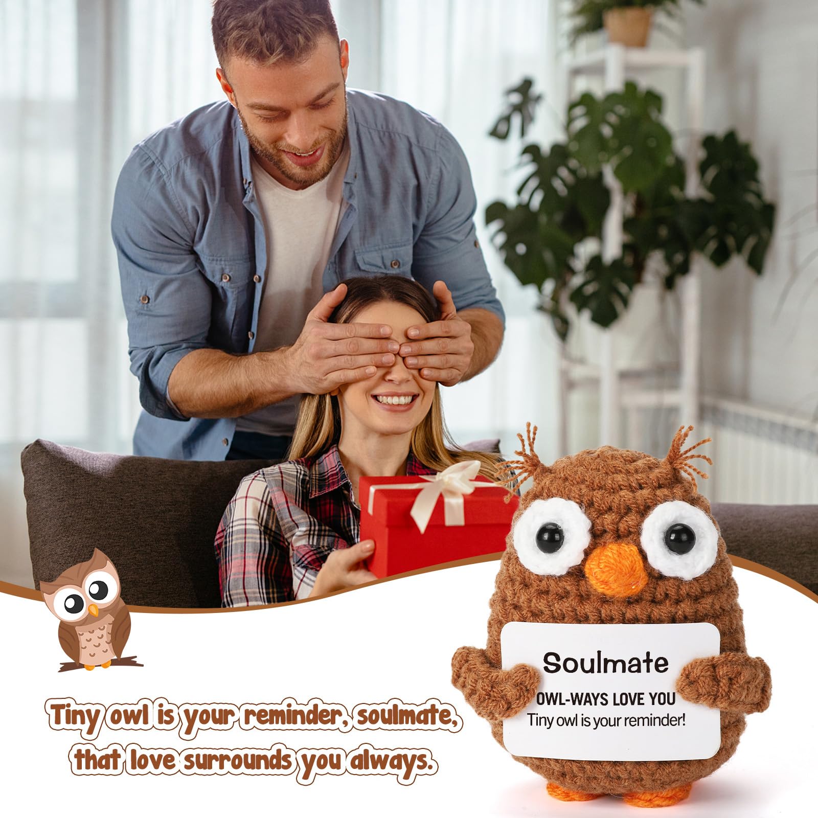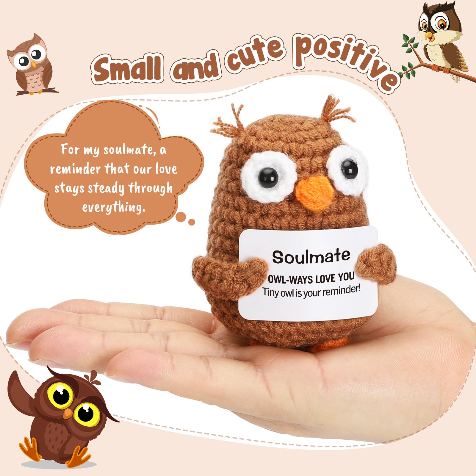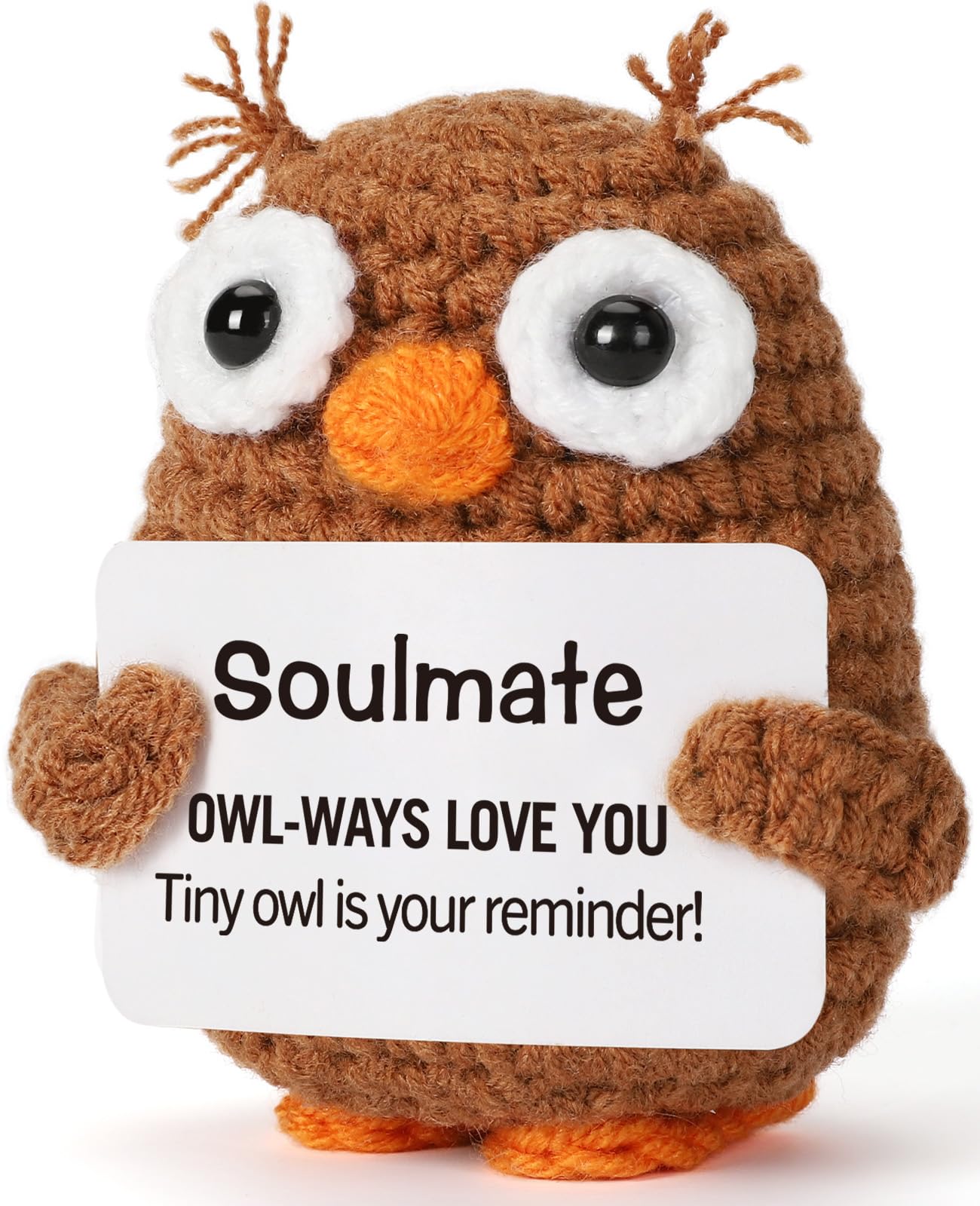 Looking for the perfect way to say "I love you" without being overly cheesy? Meet your new wingman in the world of romance and thoughtful gifting. This adorable crochet owl is more than just a decoration; it is a messenger of love, a keeper of secrets, and a steadfast companion for your soulmate. A Reminder of Love for Every Occasion Whether you are celebrating a first anniversary, looking for a standout Valentine's Day surprise, or searching for a meaningful birthday present for your husband or wife, this little guy fits the bill. It is specifically designed for those who share a special connection, making it the ultimate "Soulmate" gift. The clever play on words creates a moment of laughter and joy, breaking the ice and warming the heart simultaneously. Perfect for Long Distance Relationships Distance can be tough, but having a physical reminder of your partner can make the miles feel a little shorter. Send this crochet owl to your boyfriend or girlfriend as a "thinking of you" gesture. It serves as excellent emotional positive support, sitting quietly on their desk or bedside table, reminding them that they are loved "owl-ways." High-Quality Craftsmanship Forget about mass-produced plastic items. This crochet piece showcases the beauty of handmade artistry. The soft texture and warm colors bring a cozy vibe to any environment, be it a sterile office cubicle, a college dorm room, or a living room shelf. It is sturdy, soft to the touch, and built to last as a long-term keepsake of your relationship. Versatile Decor This isn't just a gift; it's a versatile piece of decor. Its compact size (2.16 x 1.96 x 2.95 inches) makes it perfect for: Office Desks: A stress-relief buddy during long work hours. Car Dashboards: A travel companion for road trips. Bookshelves: A literary guardian nestled between your favorite novels. Nightstands: The last thing they see before sleeping and the first thing they see waking up. Make your next gift count with a present that combines humor, sentiment, and artistry. It is the perfect way to show you care, bringing a daily dose of happiness and emotional happy support to the one who means the most to you.