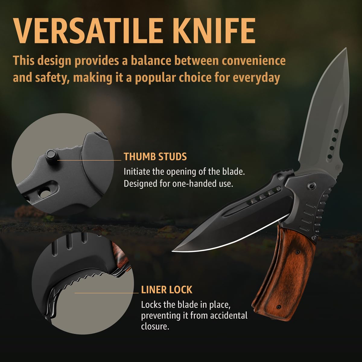 Easy to use. This hunting knife features thumb studs for smooth, one-handed blade use. The reliable liner lock ensures the blade stays securely in place during use.