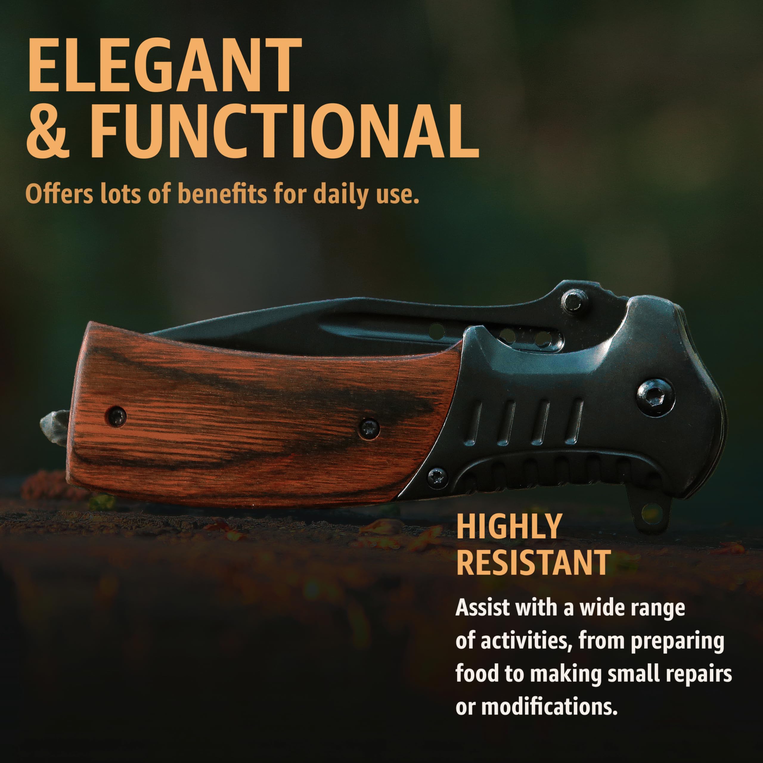 All-In-One Knife. Versatile, and ready for anything. This pocket knives & folding knives are essential for everyday versatility, camping, hiking, backpacking, work, bushcrafting, hunting, fishing, military and army needs, outdoor and DIY activities, survival, self defense, emergencies and EDC. Ideal for both women and men.