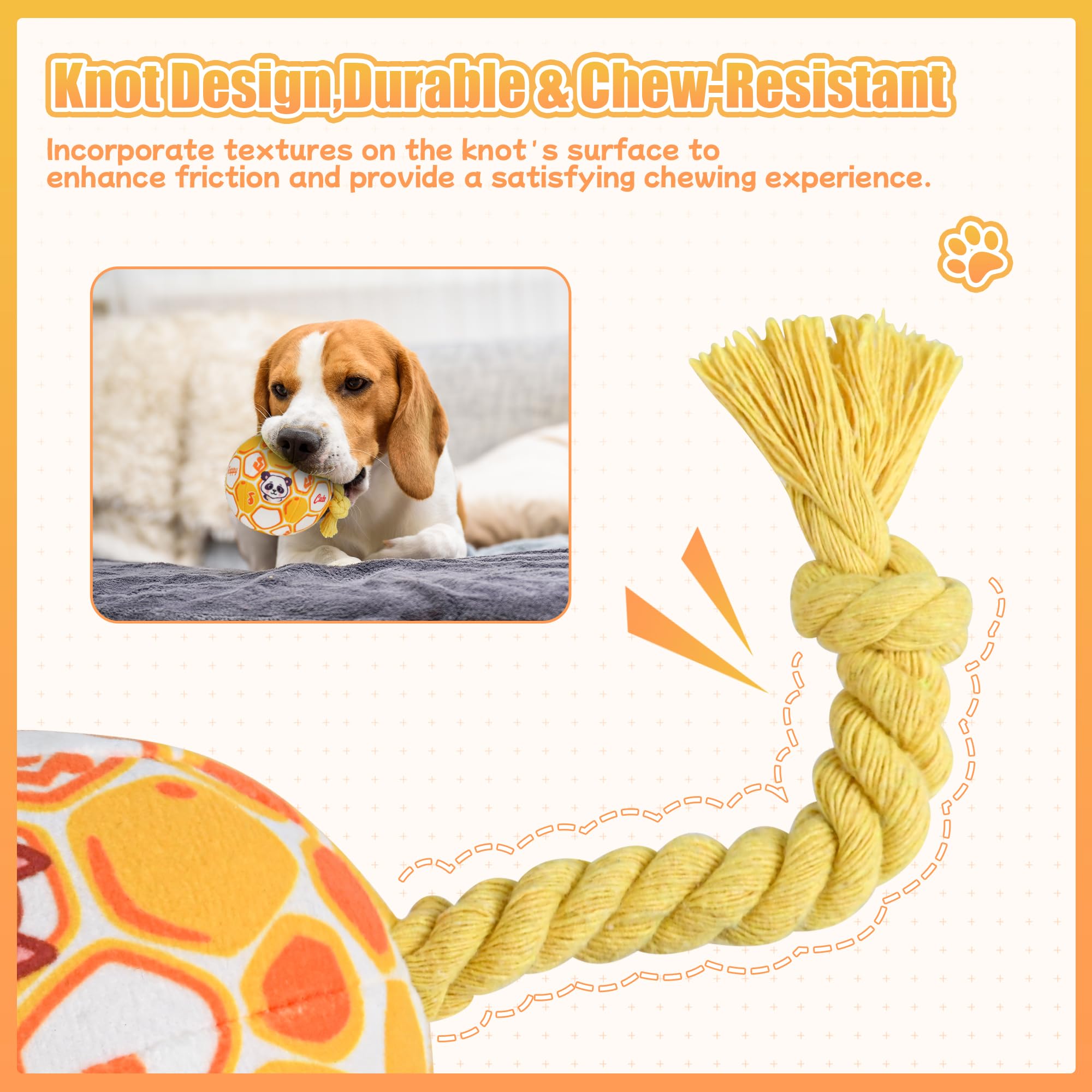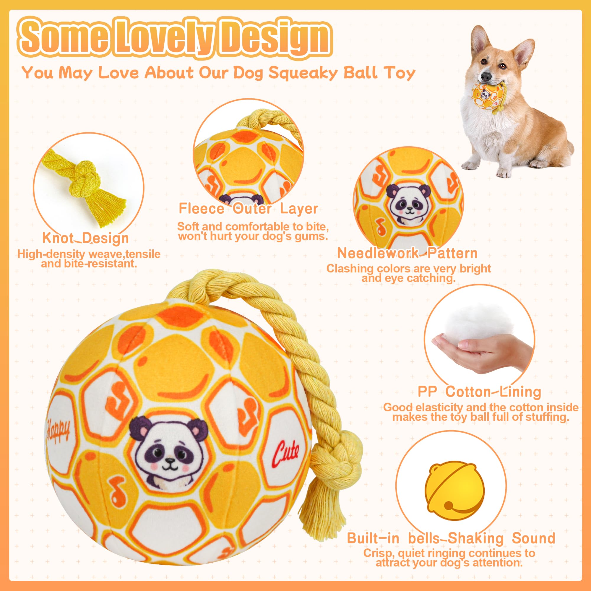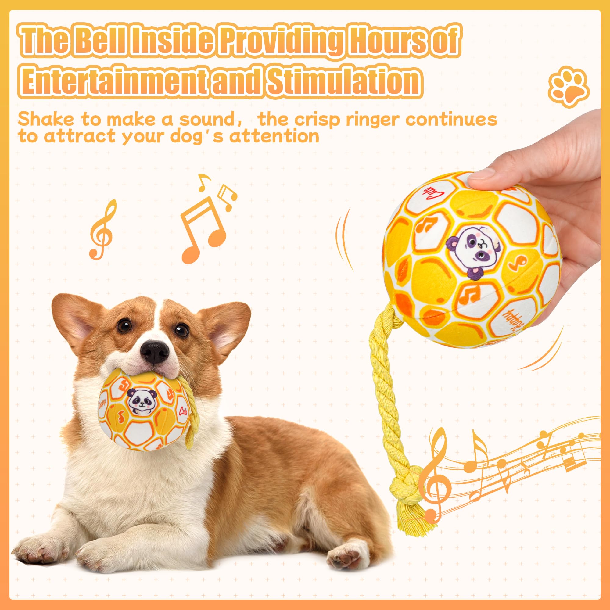 【Interactive Dog Squeaky Plush Ball Toy】 Soft Dog Stuffed Ball Toys with sturdy knotted rope sew makes it easier for the dogs to fetch, toss, tug and retrieve. It has a bell inside produces a pleasant sound when shaked as opposed to a squeaker which makes it unique. and stitched cartoon pattern on the surface attracts the dog's attention. Perfect for small dogs, puppies, and even medium Breed dogs. s attracts the dog's attention. Perfect for small dogs, puppies, and even medium dogs.