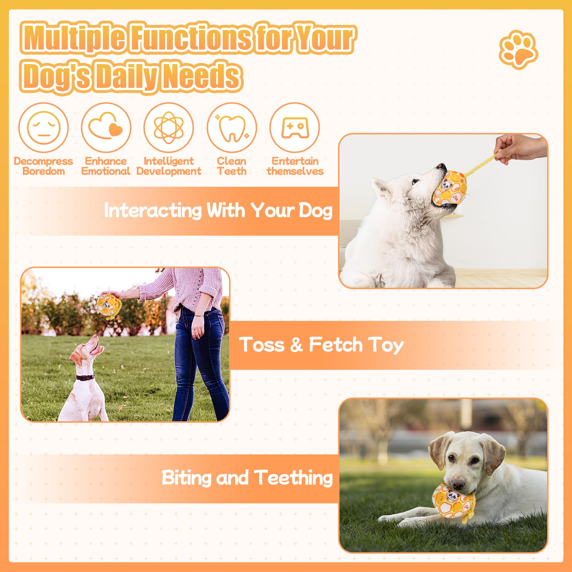 【Relieve Emotion and Teeth Cleaning】The squeaky dog toys not only can be used for bonding with your puppy, reducing stress or separation anxiety, but also can highly clean the dog's mouth, stimulate gums and reduce plaque and tartar, promote healthy teeth and increase the fun of dogs in play. These dog plush ball toy are straightforward to water and a washing machine.