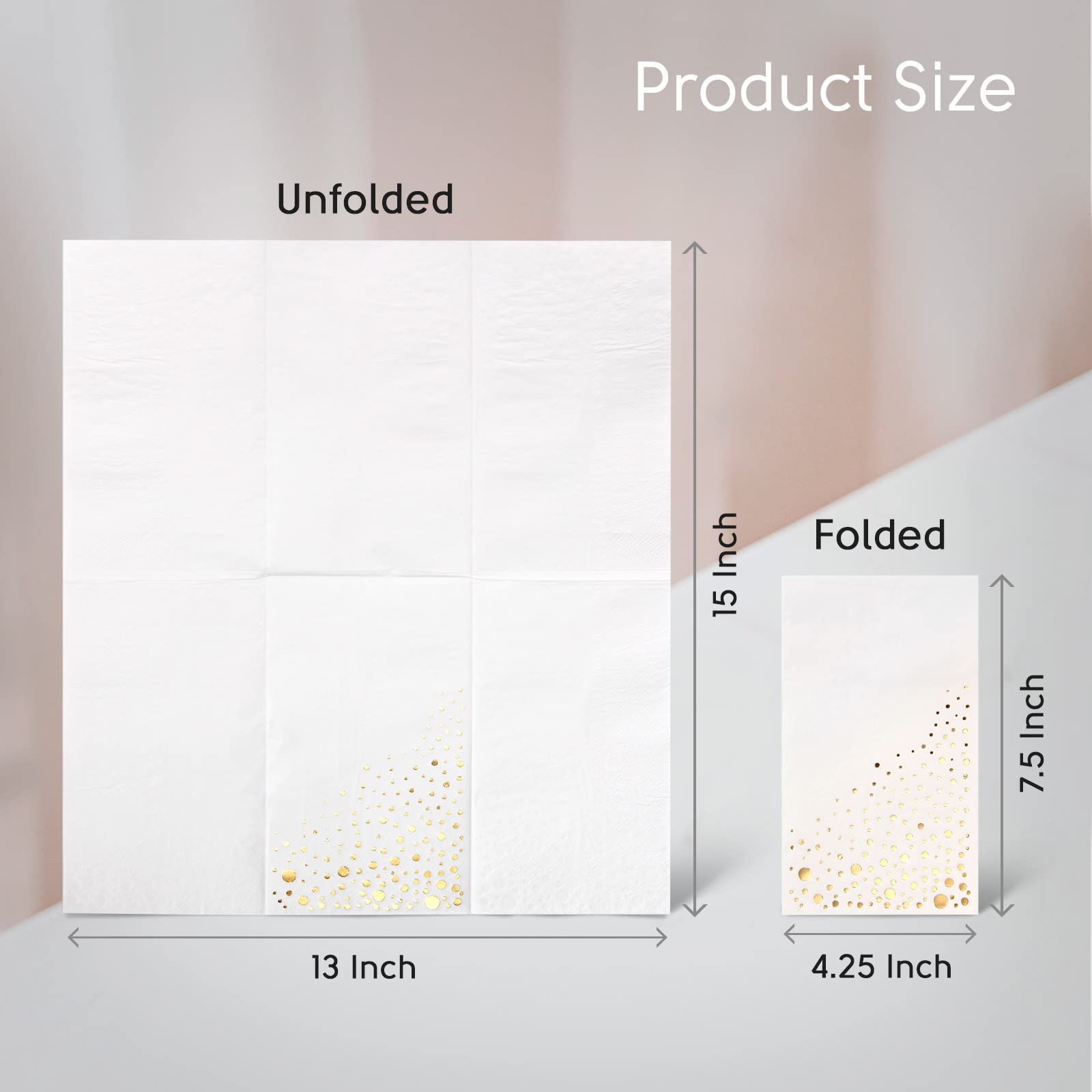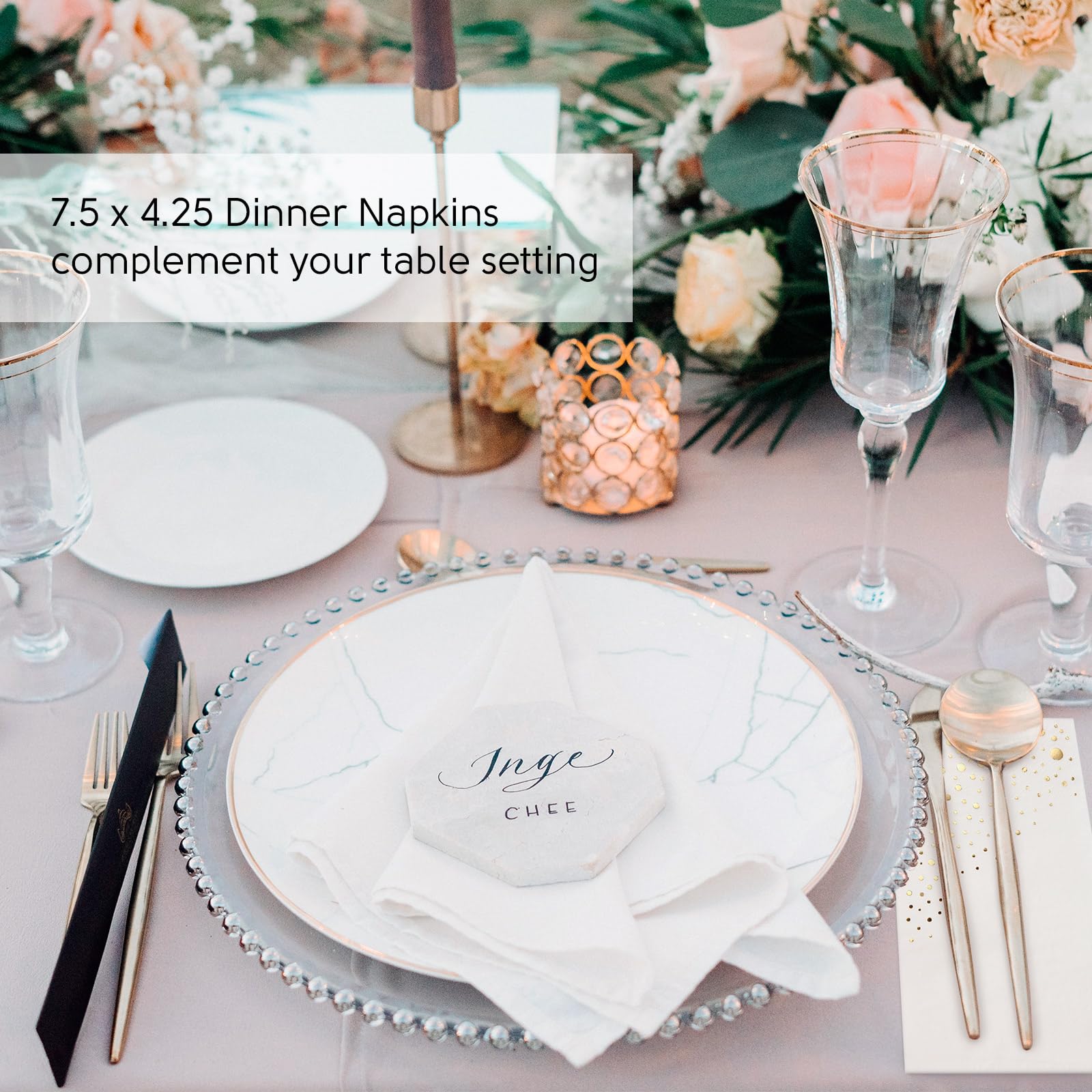 Just the Right Size. These 7.5 x 4.25 inch disposable dinner napkins are the perfect size to complement your table setting. Thick 3-ply white and gold dinner napkins can be used as dessert napkins or table napkins