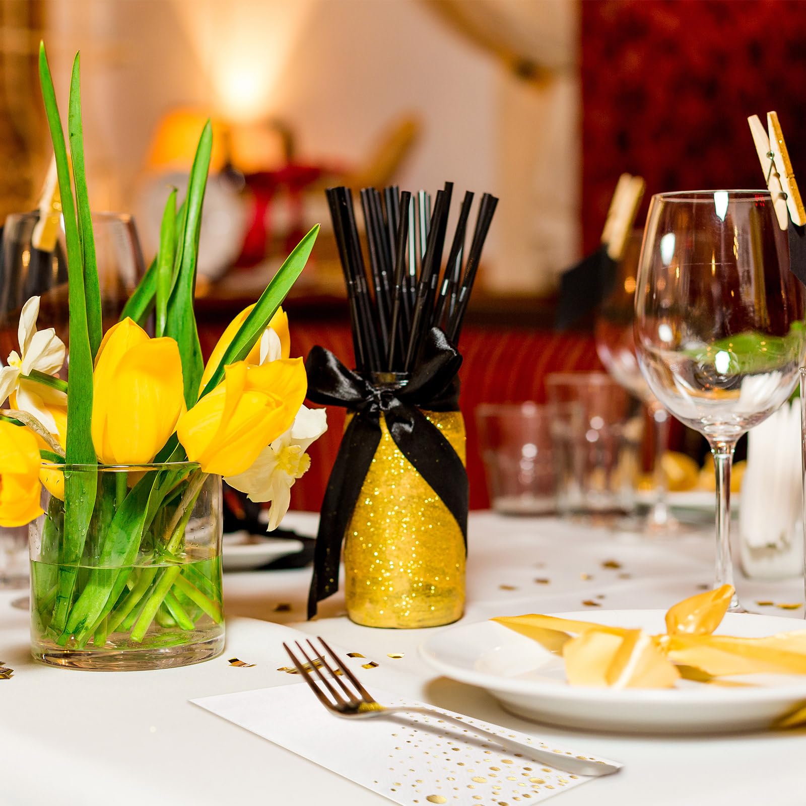 Great for All Occasions. These gold disposable napkins are ideal for everyday use to add a bit of sparkle to your evening. They are also perfect for celebrations and can be used as gold wedding dinner napkins, gold birthday napkins or new years napkins