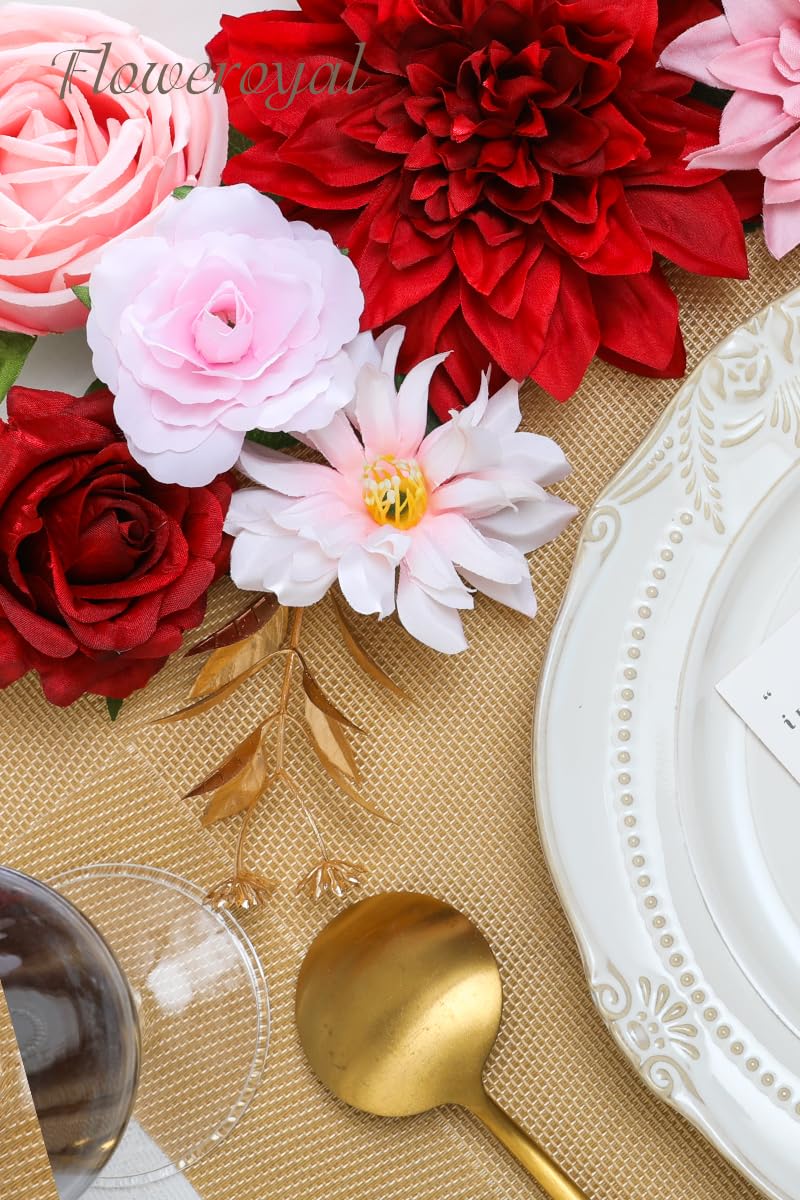 ♔GORGEOUS MIXTURE & UNIQUE DESIGN-Floweroyal artificial red flower set contains a beautiful variety of flowers, as well as some plastic stems to use for floral arrangements. The blossoms are made of silk flowers with plastic centers and greenery. Vibrant color and elegant touch make it more real. A varied mix of flower shapes and shades, which makes for a very attractive, nicely-toned arrangment. Go well with the florals you already have at home. Great for filling your living spaces.