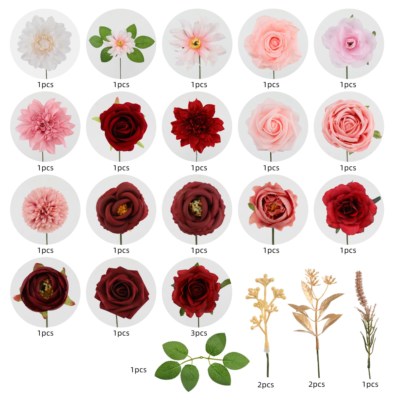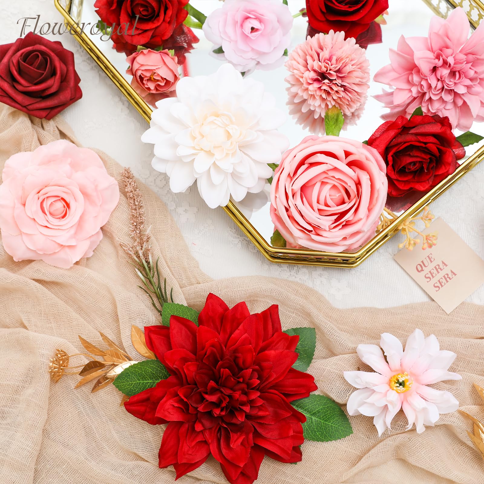 ♔RED ARTIFICIAL FLOWERS COMBO-Floweroyal faux flower set contains roses, dahlias, chrysanthemum, peonies and other accessories. All comes in a very cute box, easy giftable item.
