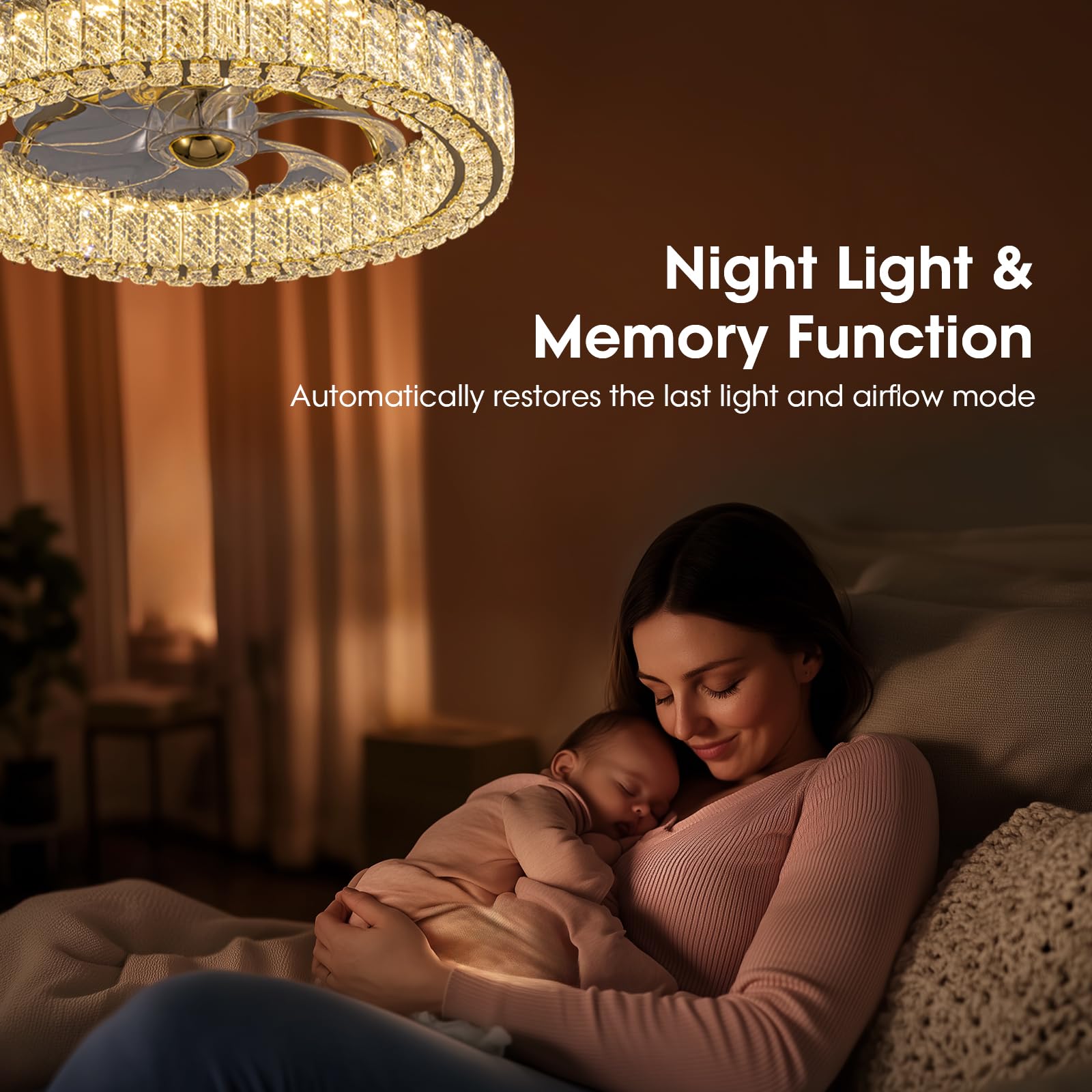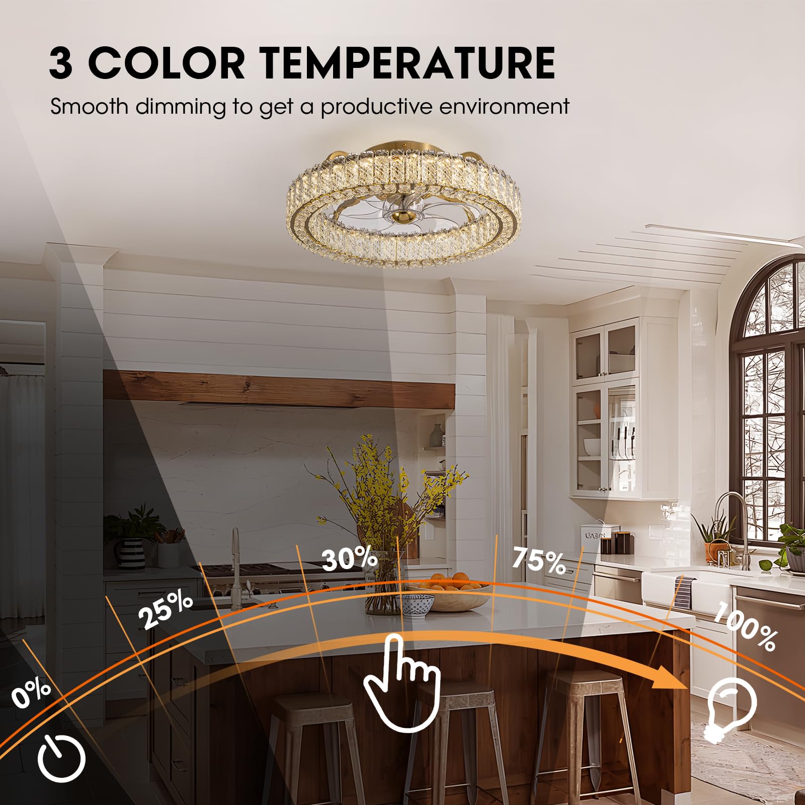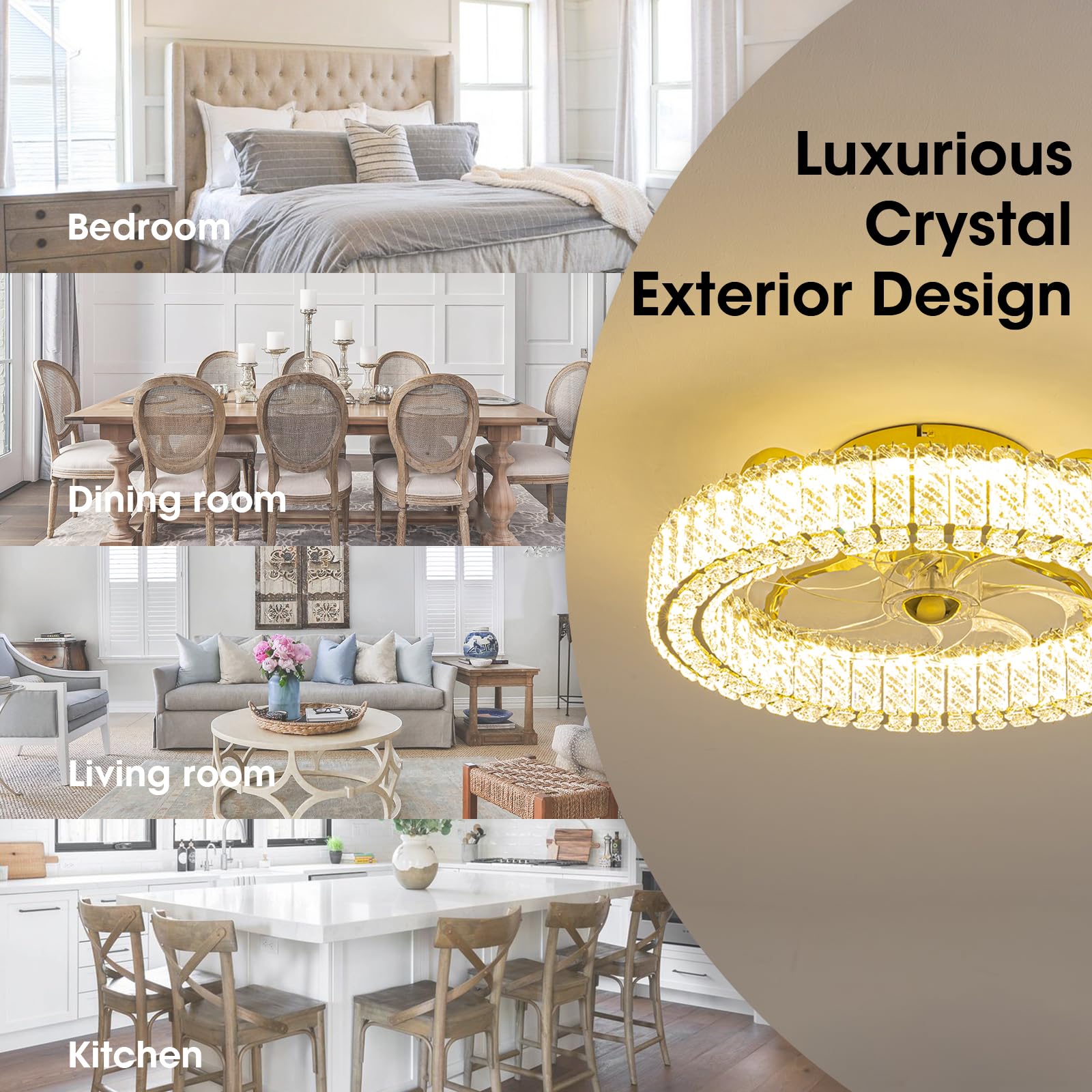 Luxury Crystal Chandelier: LUDOMIDE ceiling fan with lights saves space and money. The combination of ceiling mounted design and luxury crystal appearance is paired with a remote control and APP control, which is suitable for most rooms. You can install it in bedroom, kitchen, dining room, study room, children's room and so on.