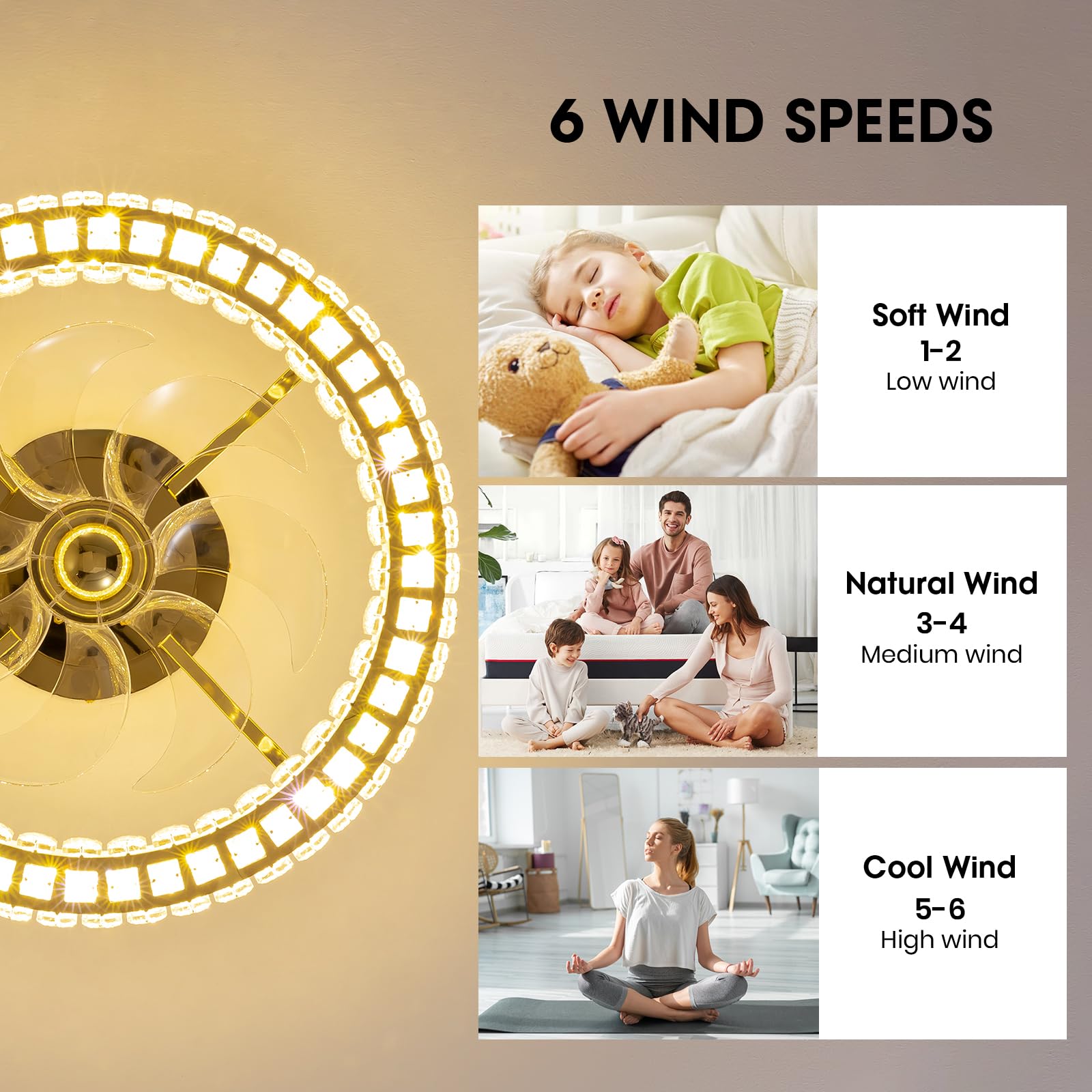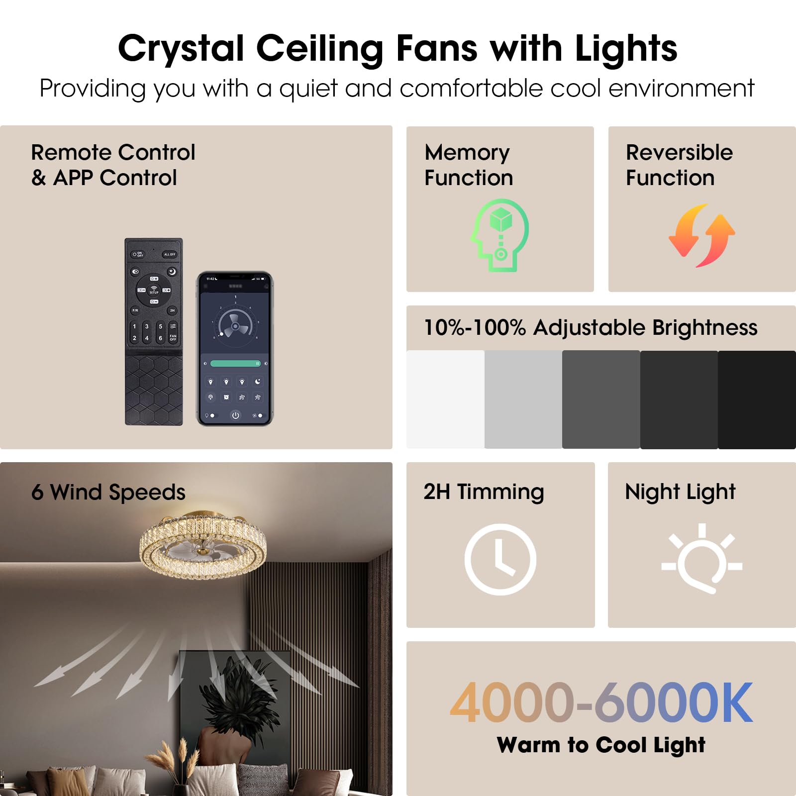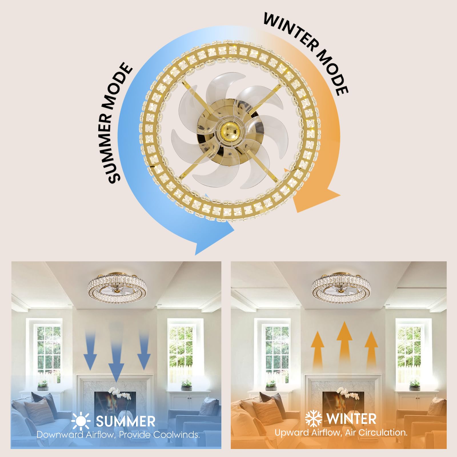 6 Speed Selection: This modern ceiling fan offers 6 adjustable speeds, allowing you to customize your cooling experience. This crystal chandelier ceiling fan features a convenient reverse rotation. On hot summer days, the forward rotation creates a cool breeze, while the reverse rotation helps to emit warm air during the colder seasons.