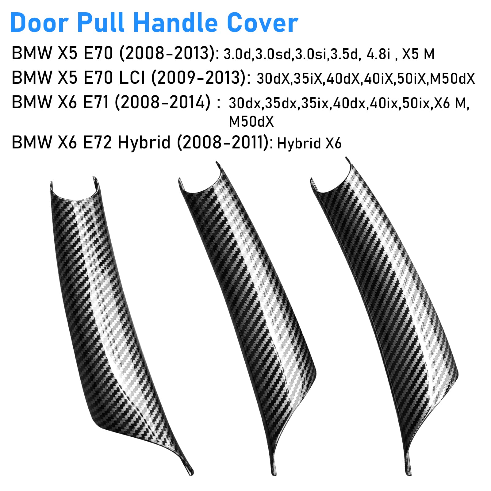【Fitment】3PCS Door Handle Cover Set Compatible with BMW X5 (E70/E70 LCI): 3.0si, 4.8i, xDrive30i, xDrive35d, xDrive48i, xDrive35i, xDrive50i,X5 M (2008-2013). 3PCS Door Pull Handle Covers Compatible with BMW X6 (E71/E72): ActiveHybrid, xDrive35i, xDrive50i,X6 M (2008-2014). Package Includes: 2x Right Side Door Handles and 1x Left Rear Side Door Handle.