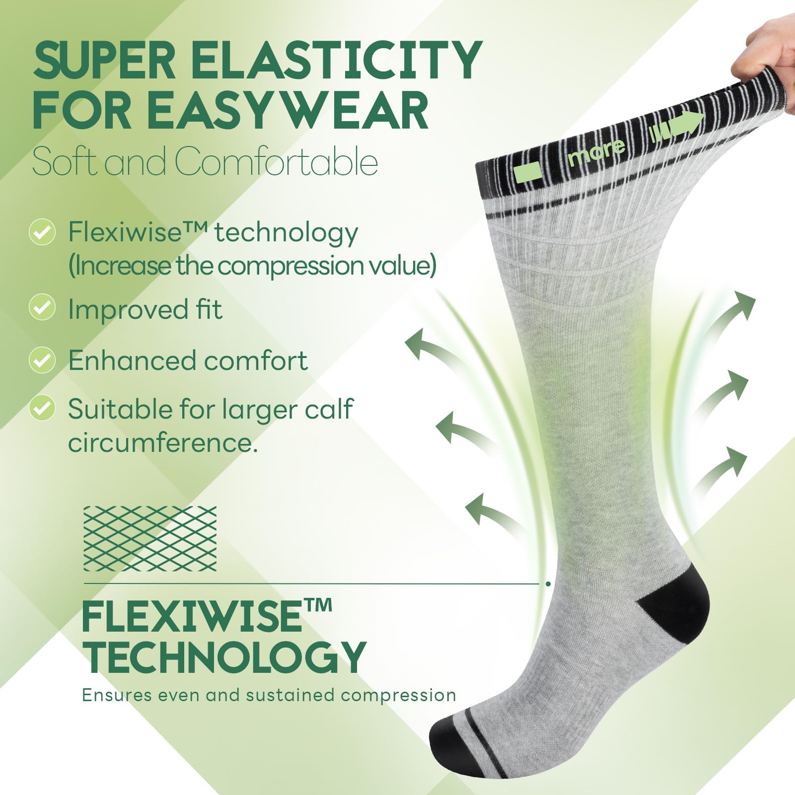 Superior Elasticity: After hundreds of wear tests, we have developed the FlexiWise blend ratio technology. While ensuring the compression levels, it provides maximum elasticity, facilitating ease of wear and enhanced comfort. This technology also offers customers greater flexibility in choosing their desired elasticity at the time of purchase.