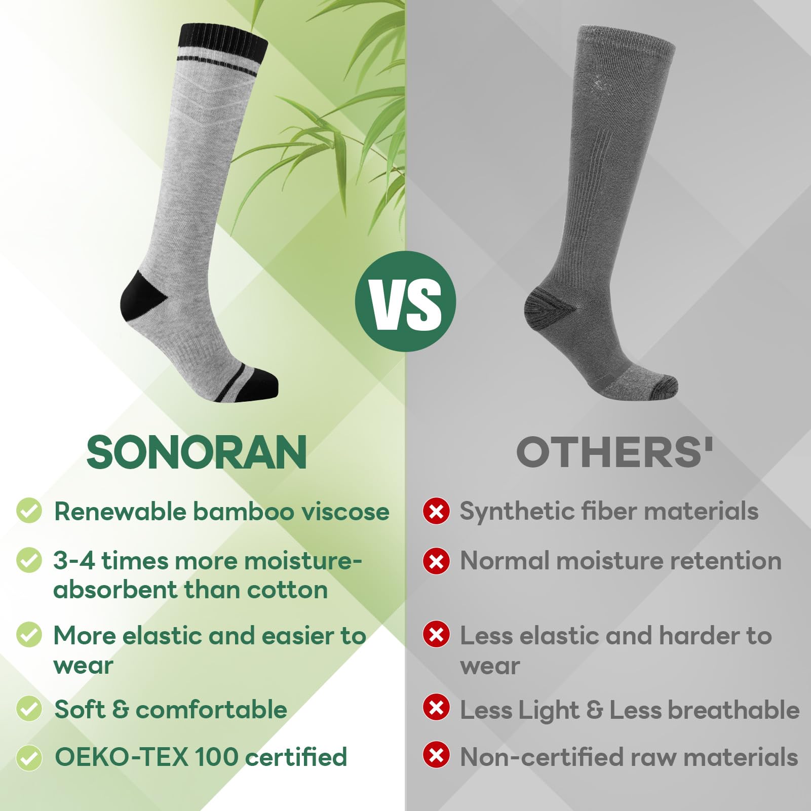 80% Viscose for Bamboo: These compression socks are made from 80% natural viscose for bamboo, offering excellent breathability, moisture-wicking, and softness. Warm in winter and cool in summer, making them ideal for individuals with sensitive skin or for prolonged wear. The viscose fibers absorb 3-4 times more moisture than cotton!