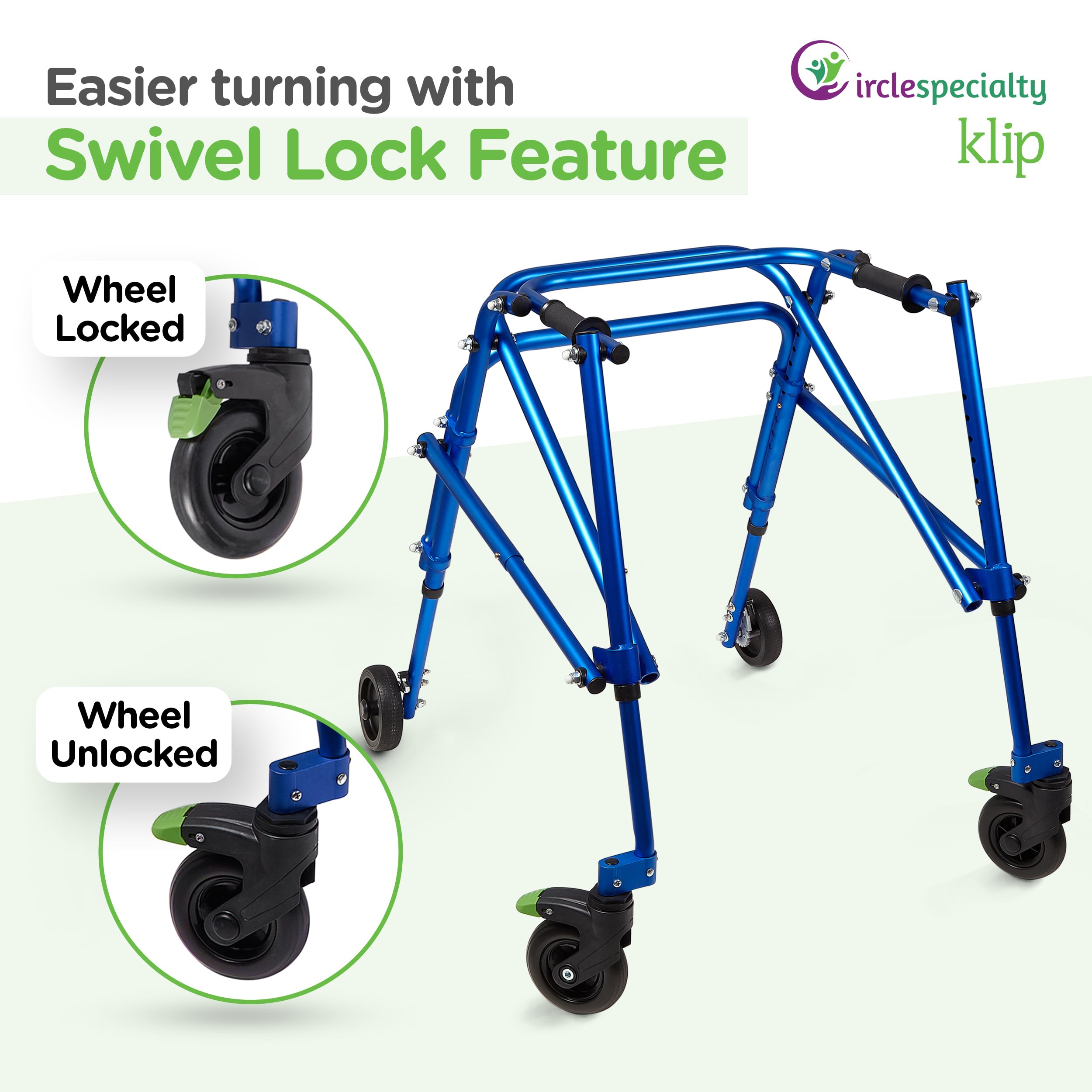 PRACTICAL, DEPENDABLE & COOL LOOKING- The 4-Wheeled, Foldable Klip Walker/Gait Trainer is equipped with two 5” Front Swivel Wheels that allow for easier turning, and two 5” On/ Off, One-Directional Rear Wheels that prevent backwards rolling. Additionally, there’s an easy-to-engage/disengage, foot-activated swivel wheel lock that switches the wheel from swivel to non-swivel with an audible click, for greater control & safet