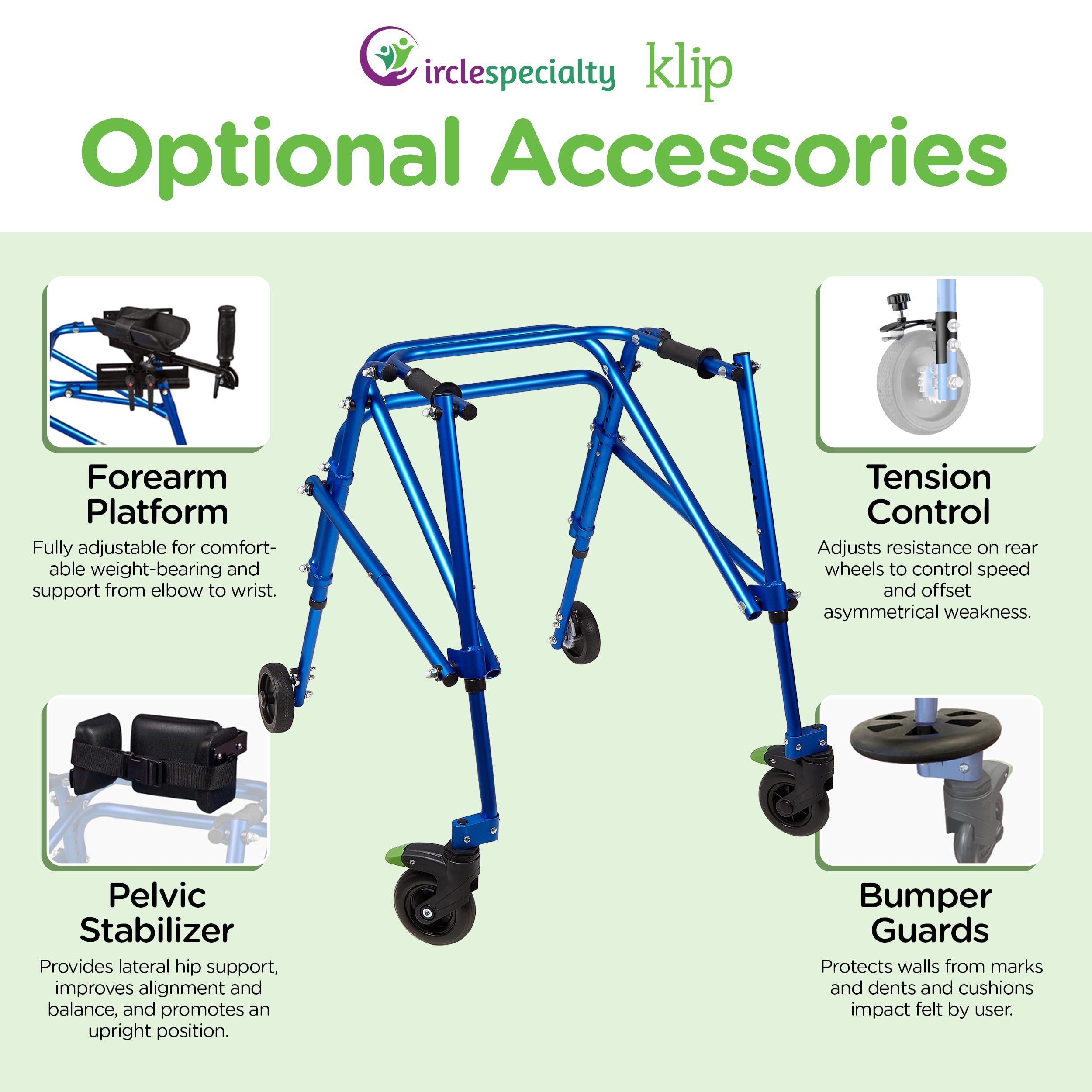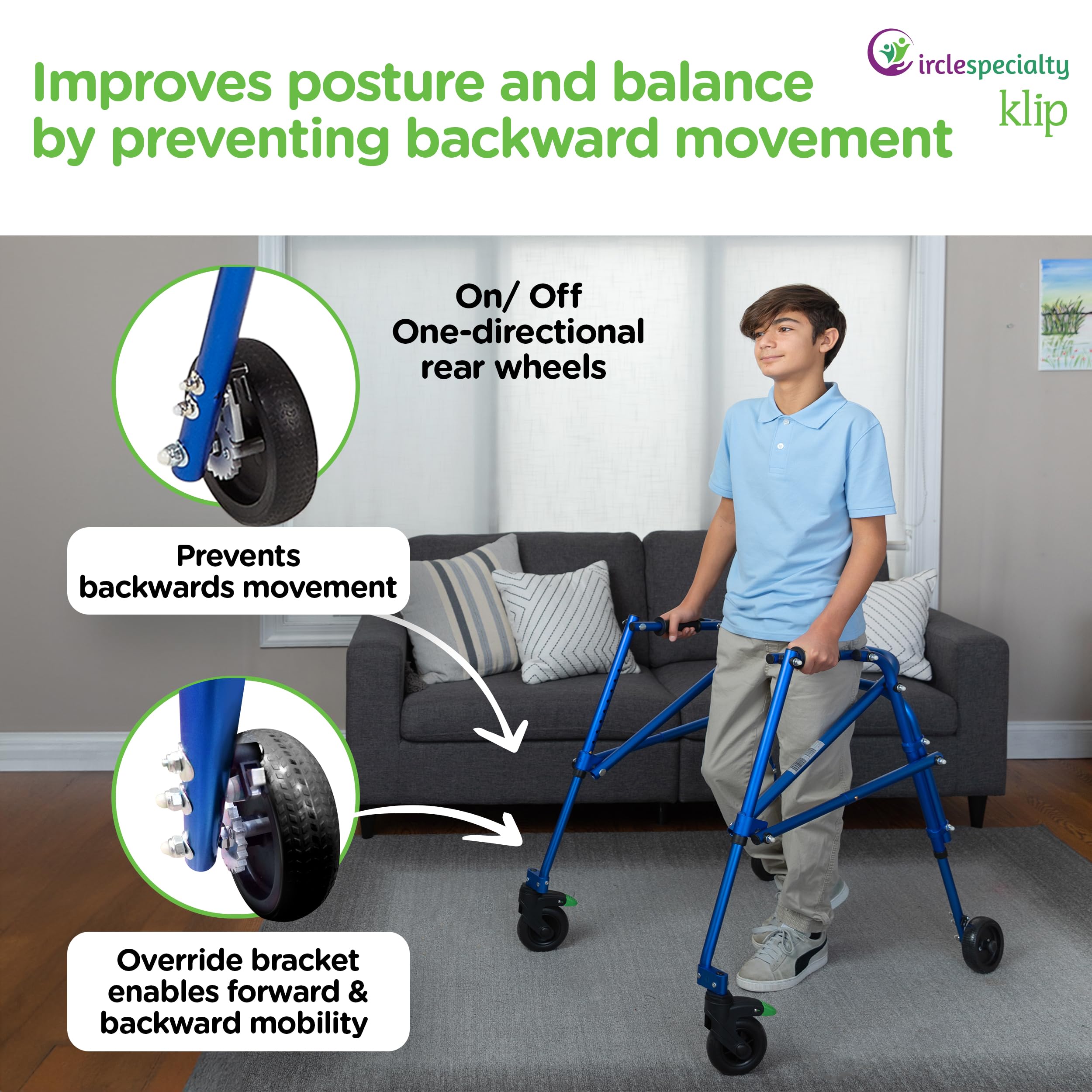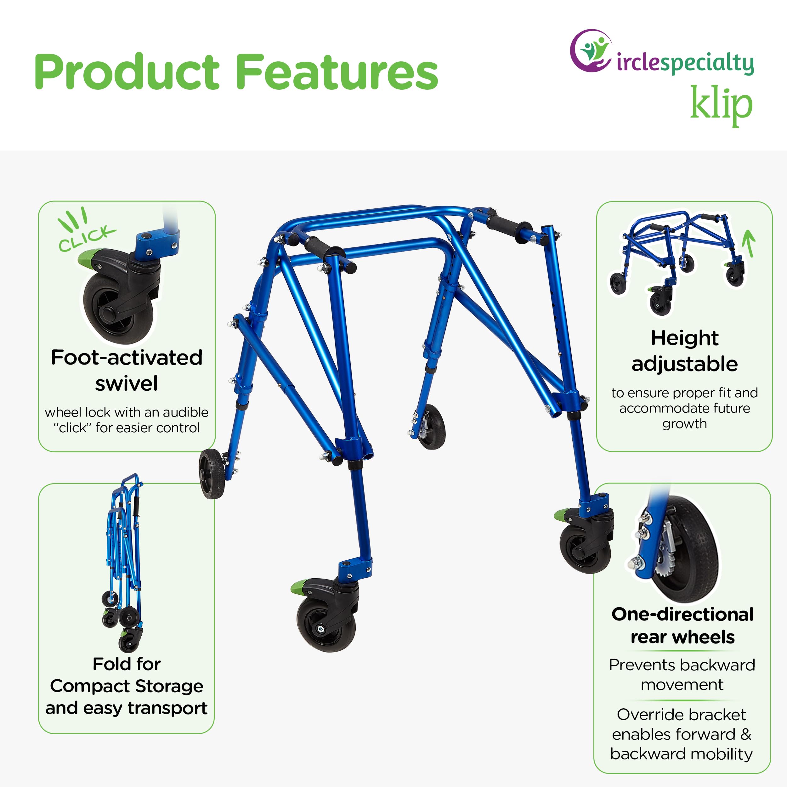 4-Wheel Posterior Walker/Lightweight Rollator Walker by Circle Specialty Circle Specialty is a company with over 25 years of experience in medical rehabilitation equipment and our mission is to keep kids, teens and their families on the go by covering their full spectrum of needs. We strive to deliver products with a high-impact factor that improves your quality of life, and our posterior walkers, serve that exact purpose. Introducing the 4-Wheel Posterior Walker/Gait Trainer that Features: ✅ Height adjustable to ensure proper fit and accommodate future growth ✅ Foot-Activated swivel wheel lock with an audible “click” for easier control ✅ On/off one-directional rear wheels prevents walker from rolling backwards. ✅ Latex-free handgrips with flanged ends reduce strain on user’s hands ✅ Folds easily for compact storage and transport ✅ Available in 4 sizes More Freedom, More Mobility, More Dependability From the aluminum frame to all the little quality-of-life details of our designs, our medical walker was created to keep toddlers, kids, teens and young adults moving & enjoying life. Optional Accessories As a company, Circle Specialty strives to deliver professional rehabilitation equipment that cater to your exact needs, and make the transition from gait trainers to walkers effortless as the user improves their ability. Optional Accessories include: ✅ Height and depth adjustable forearm platforms with multi-adjustable handgrips ✅ Width and height adjustable pelvic stabilizer with a support belt ✅ Bumper Guards & Speed tension control on rear wheels Fully Backed by our 3-Year Warranty Click “Add to cart"
