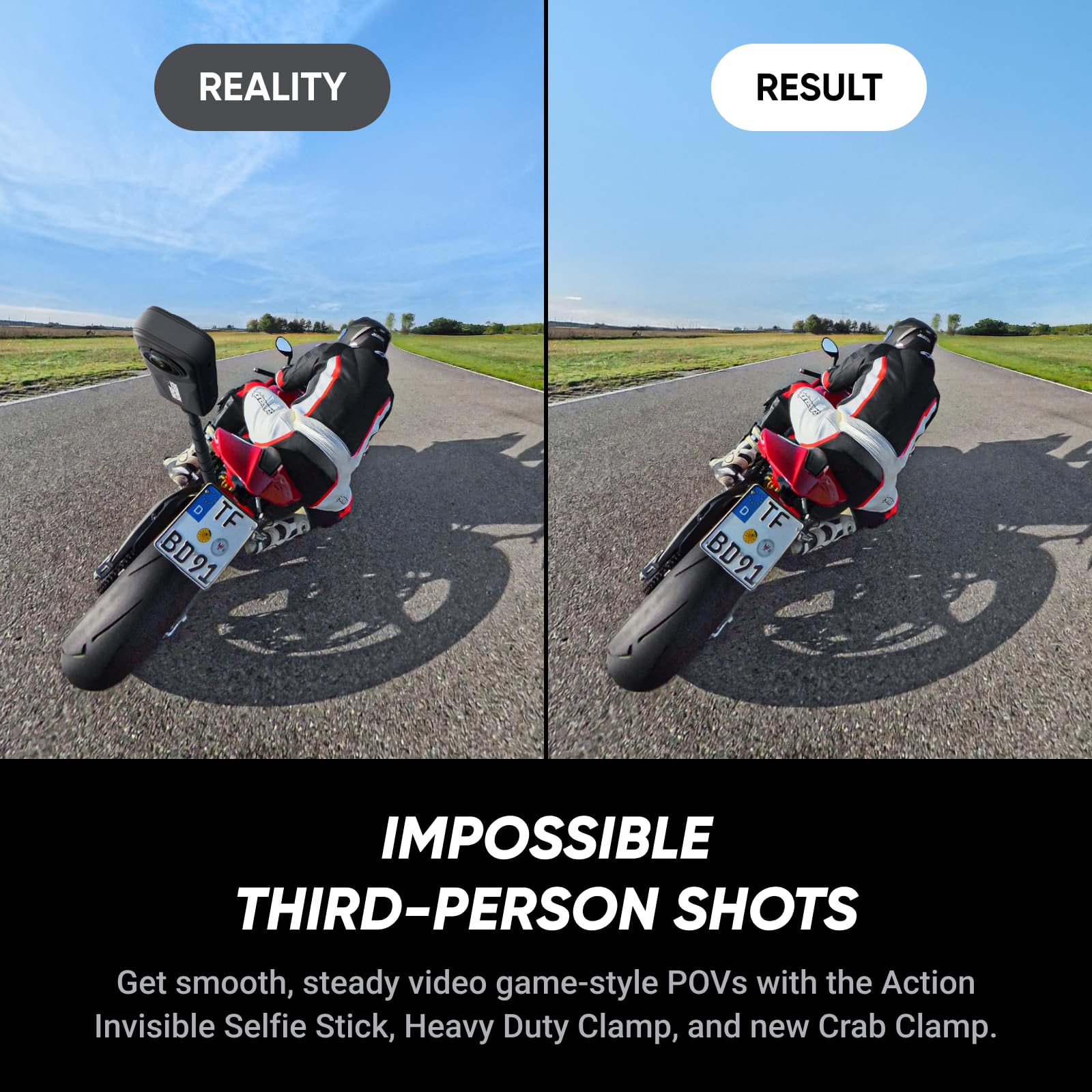 Invisible Selfie Stick: Create impossible third-person views with no selfie stick in sight! Capture everything in 360°, then choose your angles later using AI-assisted reframing—perfect shots, every time.*Invisible Selfie Stick sold separately.