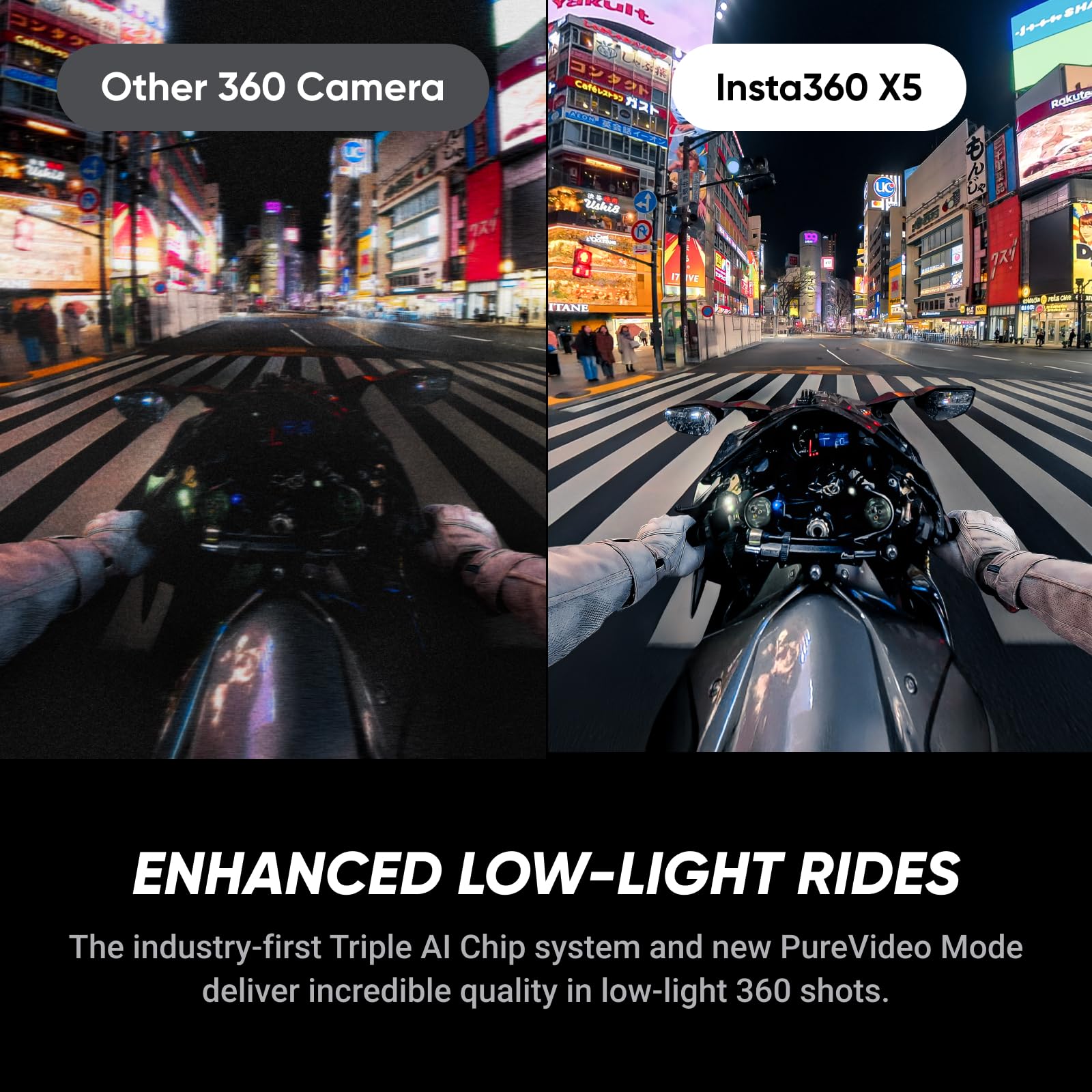Triple AI Chip Design, Better Low Light: Shoot confidently even in challenging lighting. X5’s triple AI chip design powers advanced noise reduction and image processing, delivering crisp, vibrant footage even in dim or night conditions.