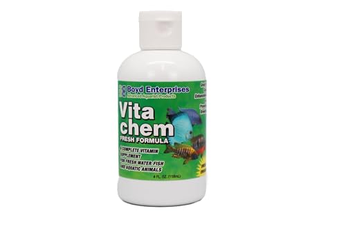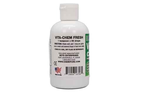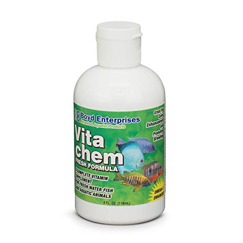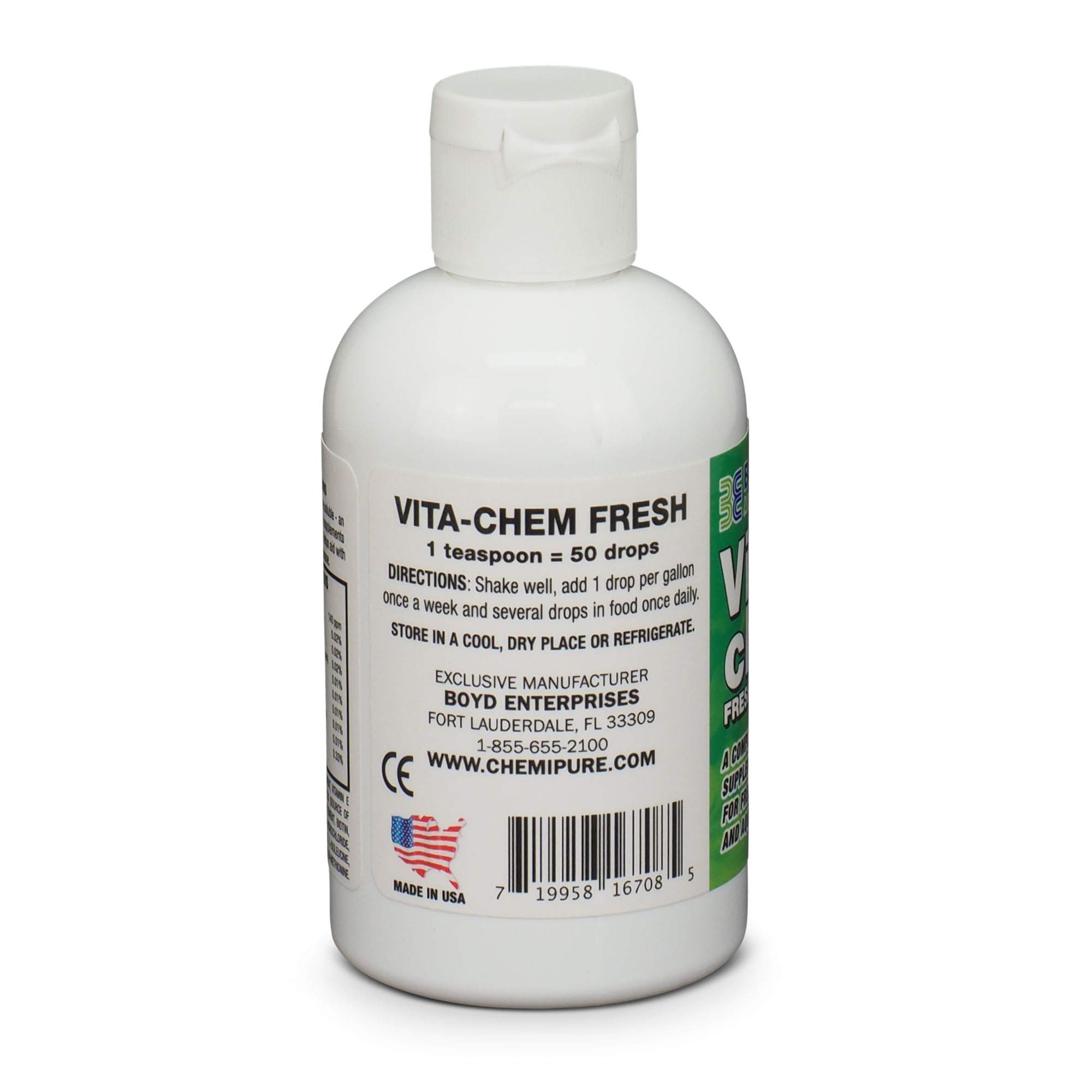 Vitachem is a pre-stabilized multi-vitamin that is water and tissue soluble-it's a revolutionary concept in vitamin supplements for freshwater, saltwater and invertebrates kept in closed systems. Vitachem is excellent for fin regeneration and correcting lateral line disease. Vitachem brings out the natural colors in fish. It has been tested by some of the most experienced breeders, hobbyist and public aquariums for over 20 years producing consistent results like better spawn and growth rates. Vitachem Fresh has 30, naturally occurring extracts from live organisms bonded with amino acids. Shake well, add 1 drop per gallon once a week and several drops in food once daily. Store in a cool, dry place or refrigerate.