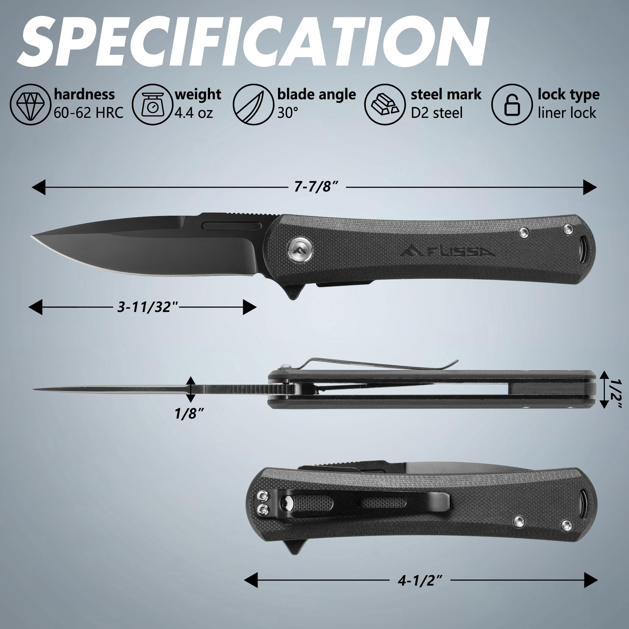 Premium D2 Steel Blade: The knife blade is made of D2 steel, which is sturdy, durable and easy to clean. With sharp cutting performance and outstanding strength, this pocket folding knife is perfect for cutting and peeling . Blade hardness: 60-62HRC.