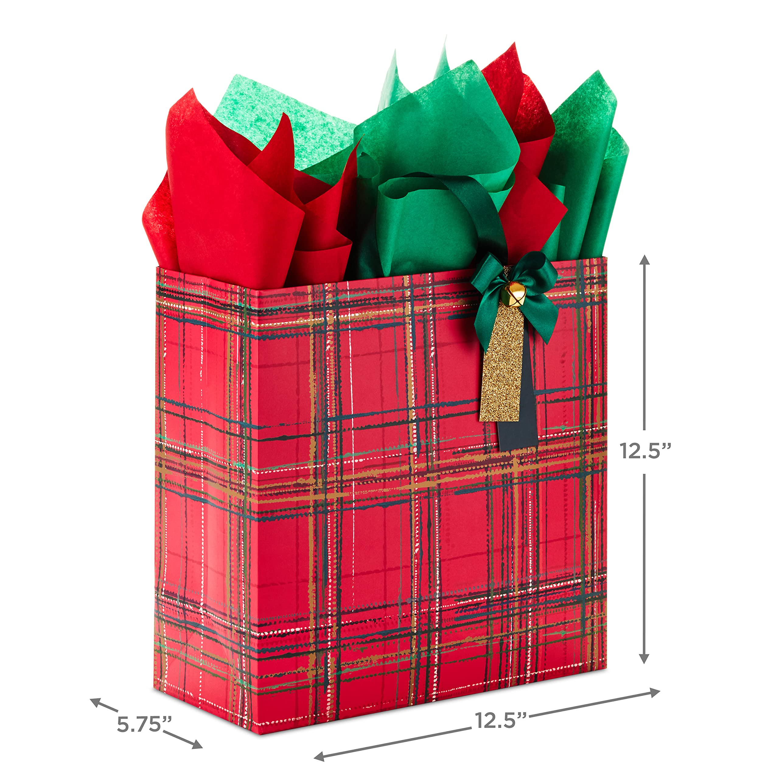 Share more merry! Add joy to the holiday season with a striking premium Christmas gift bag. This square bag features an elegant design including metallic gold accents with red and black tartan plaid and premium additions including a bow, gift tag and jingle bell. Purchase includes 2 sheets of tissue paper to make wrapping holiday gifts quick and easy. The Hallmark brand is widely recognized as the very best for greeting cards, gift wrap, and more. For more than 100 years, Hallmark has been helping its customers make everyday moments more beautiful and celebrations more joyful.