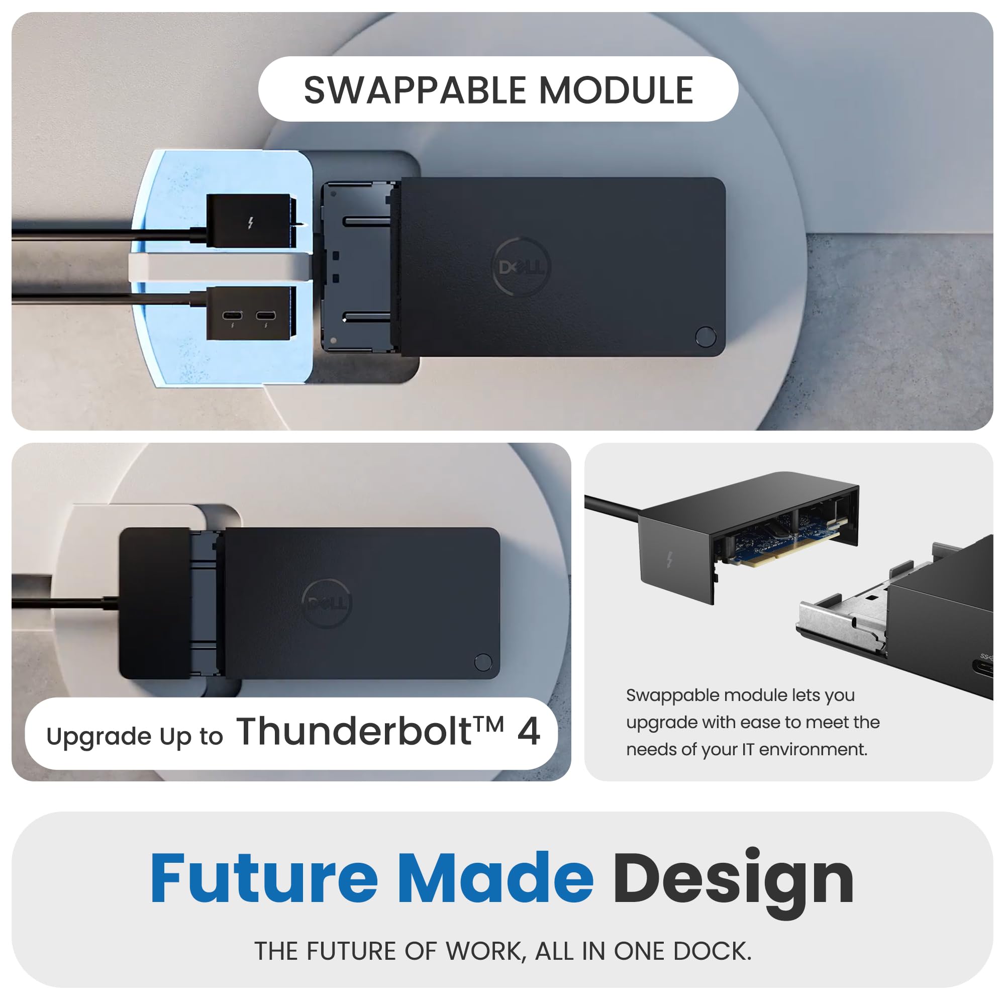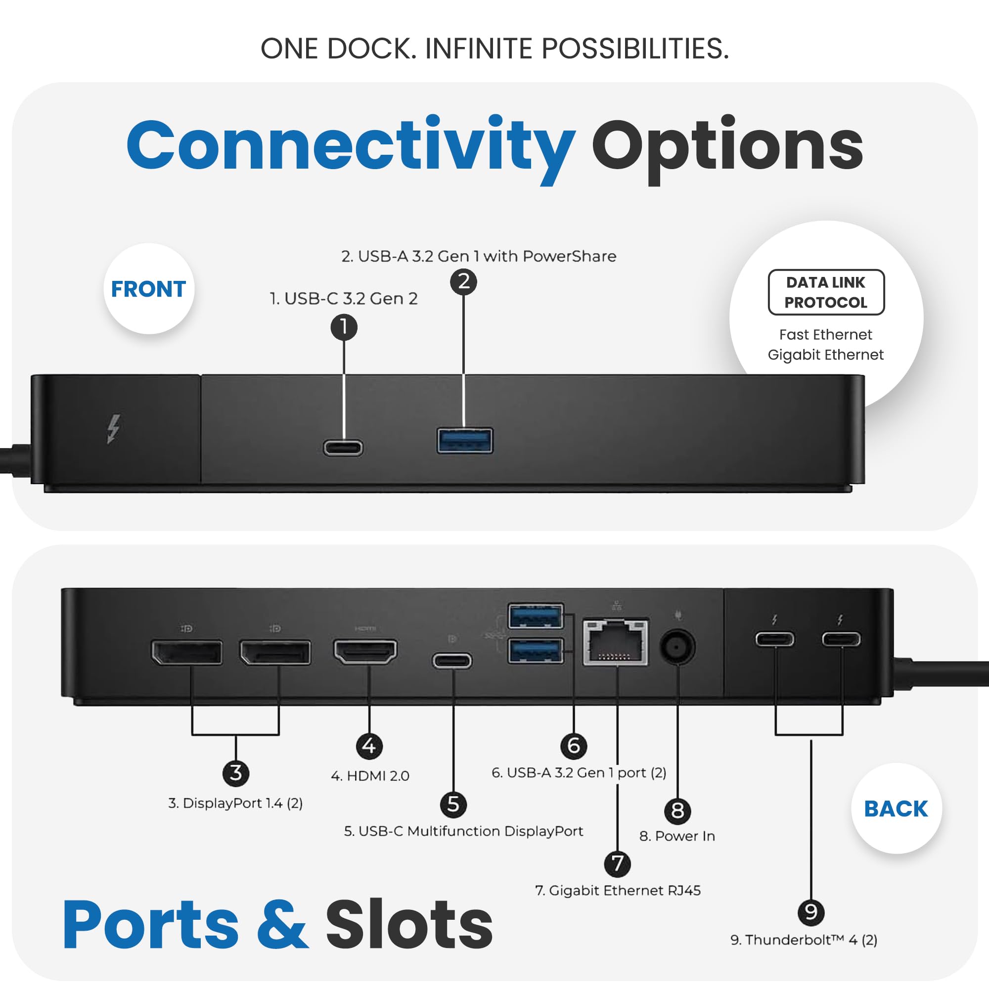 [PORTS & SLOTS] - This dock features a total of 13 ports & slots: 𝗧𝗢𝗣 - Sleep/Wake up/Power button. 𝗙𝗥𝗢𝗡𝗧 - 1x USB 3.2 Gen 2 Type-C port, 1x USB 3.2 Gen 1 port with PowerShare. 𝗕𝗔𝗖𝗞 - 2x DisplayPort 1.4, 1x HDMI 2.0, 1x USB 3.2 Gen 2 Type-C port with DisplayPort 1.4 Alt Mode, 2x USB 3.2 Gen 1 ports, 1x Gigabit Ethernet Network connector (RJ-45), 1x Power Connector, & 2x Thunderbolt 4 ports (40 Gbps, 15 W) incl. Thunderbolt 4 host port (40 Gbps, 130 W power delivery). 𝗥𝗜𝗚𝗛𝗧 - 1x Wedge-shaped lock slot, 1x Kensington security-cable slot