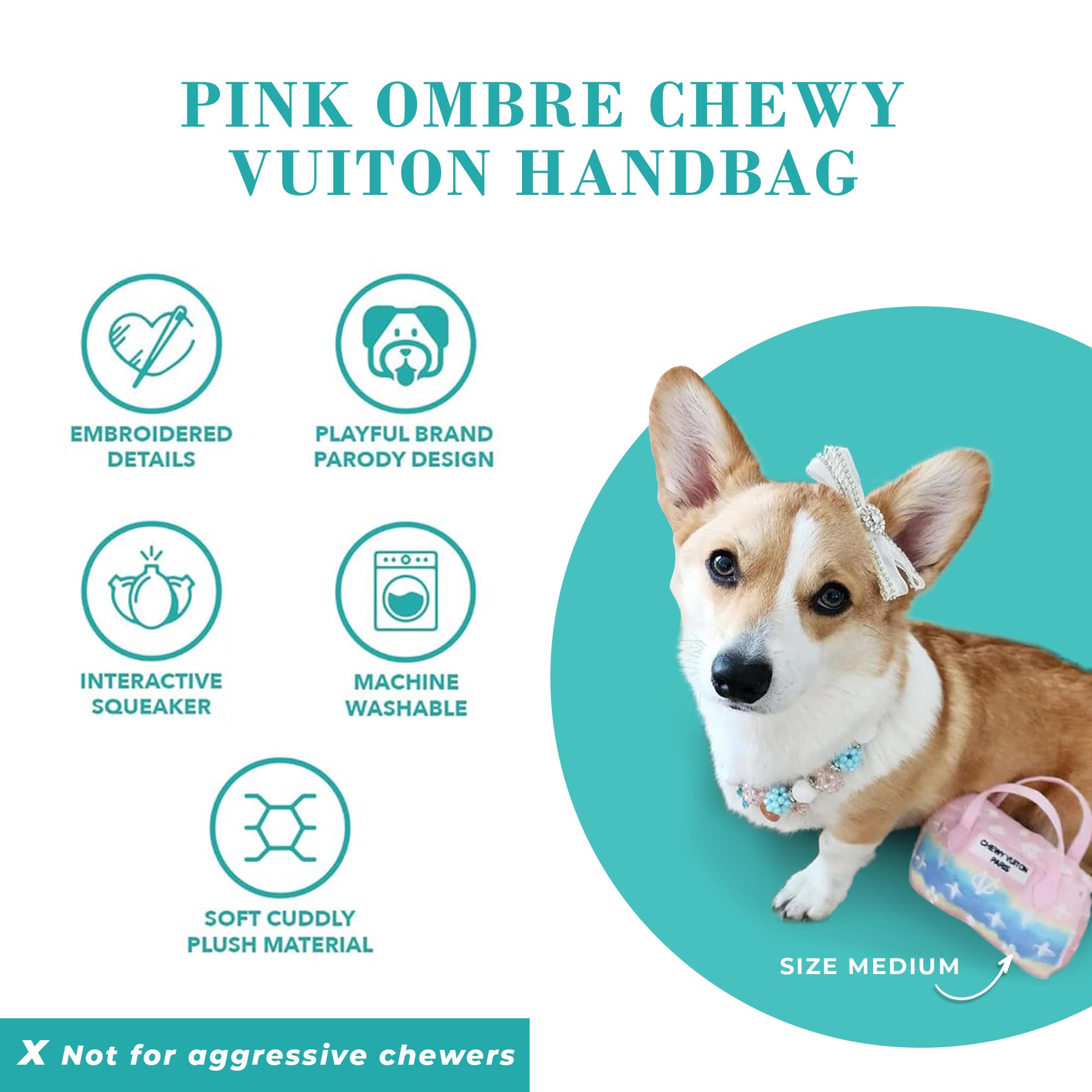 Funny Parody Plush Dog Toy: Let your furry fashionista fetch or strut some fashion-forward fun with this Pink Ombre Chewy Vuiton Handbag in a stylish pink ombre color with a white monogram pattern on the plush exterior and a built-in squeaker hidden inside. It’s a playful, cute interactive dog toy that combines style & fun. Size Small 4.5"x5”x3”.