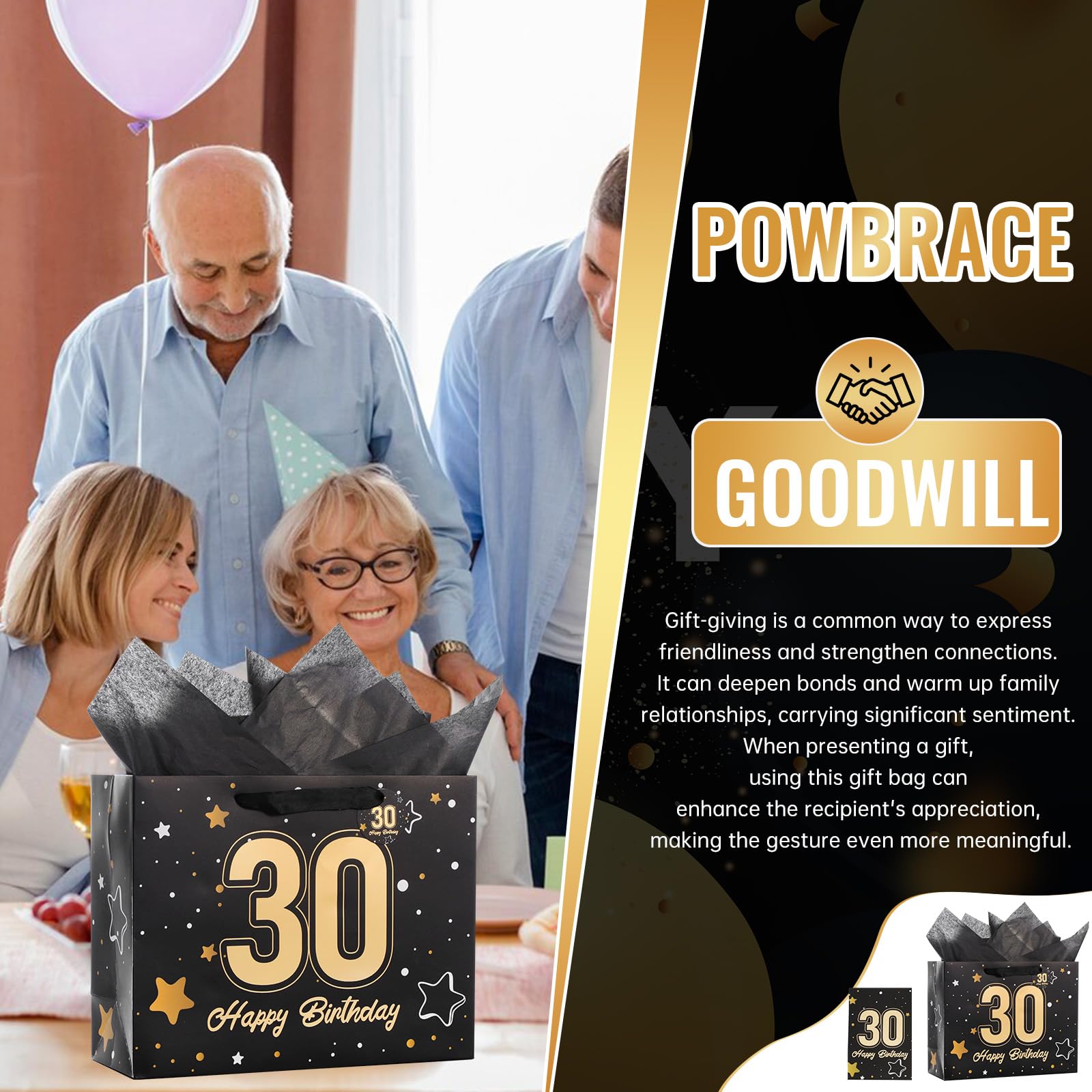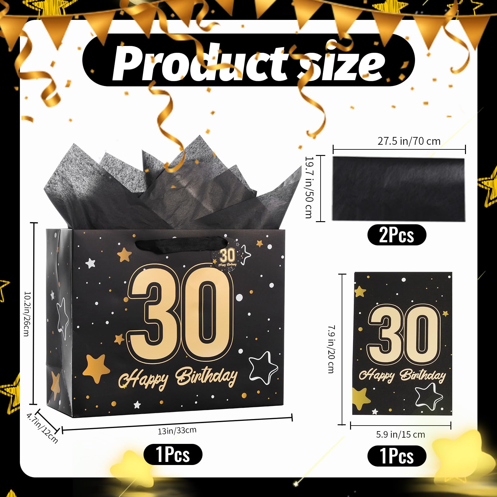 【30th Birthday Gift Bag】This 60th birthday gift bag set includes matching tissue paper, a greeting card, and tags. The decorative ribbon handles add a festive touch. It simplifies gift wrapping for a hassle-free experience. The gift bag measures 13" W x 10.2" H x 4.7" L; the card measures 7.9" W x 5.9" H.