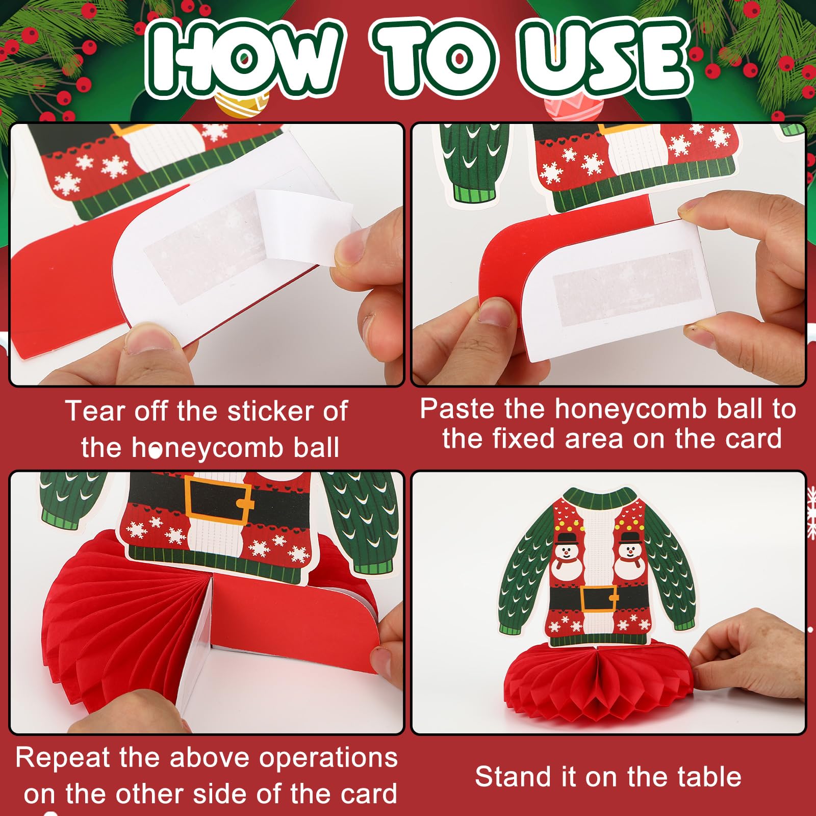 Easy Installation: Simply unfold and attach the Ugly Sweater Honeycomb Table Topper in seconds—no tools needed! just peel off the sticker and stick the honeycomb ball to the card fixed position, align and unfold it. you can get a cute and exquisite 3D Christmas table decoration in seconds,Instant festive decor with minimal effort