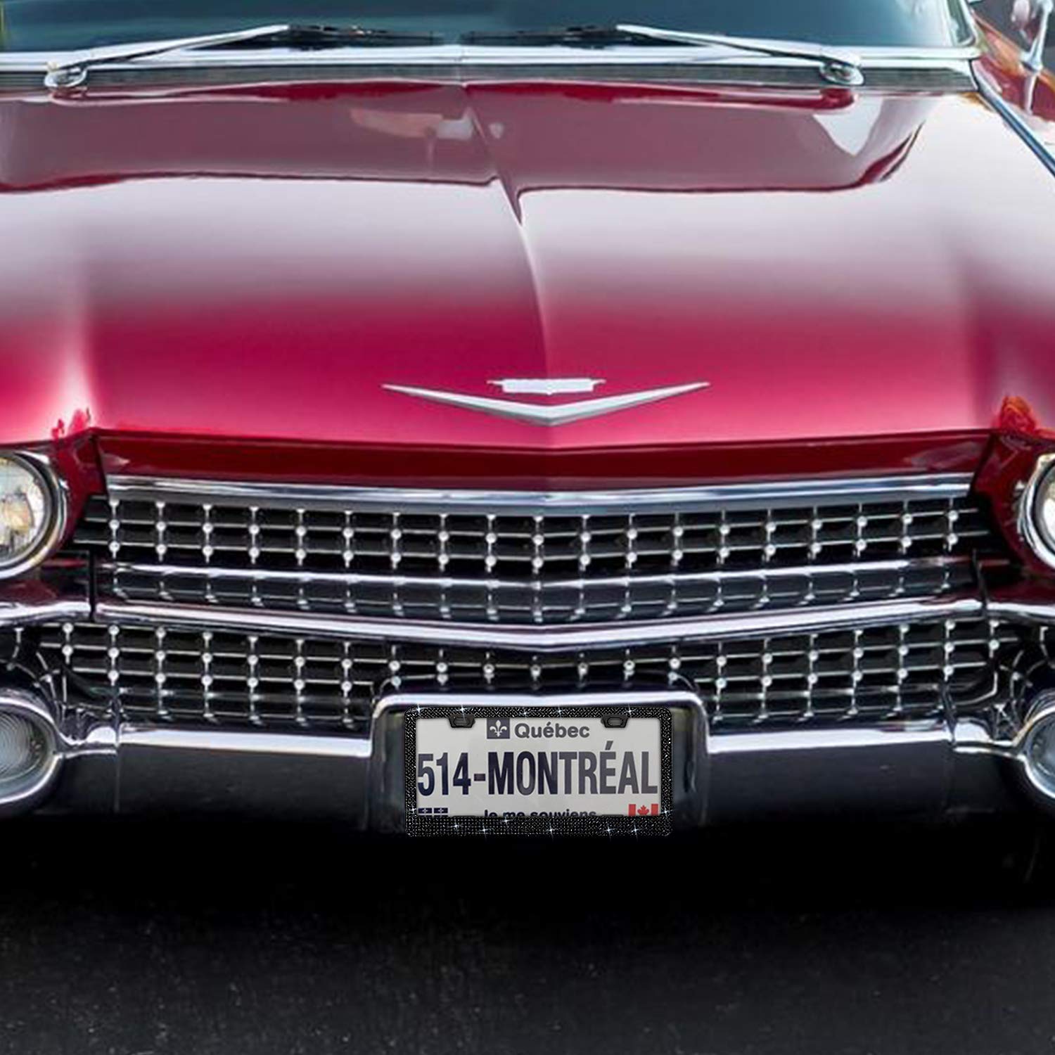 License plate frame with black color:Stainless Steel Frames Over 1000 pcs Finest 14 Facets Clear Glass Rhinestone Crystals. The edge of the black license plate frame has been ground to prevent scratching the car’s paint. This set comes with AA SS16 Rhinestones