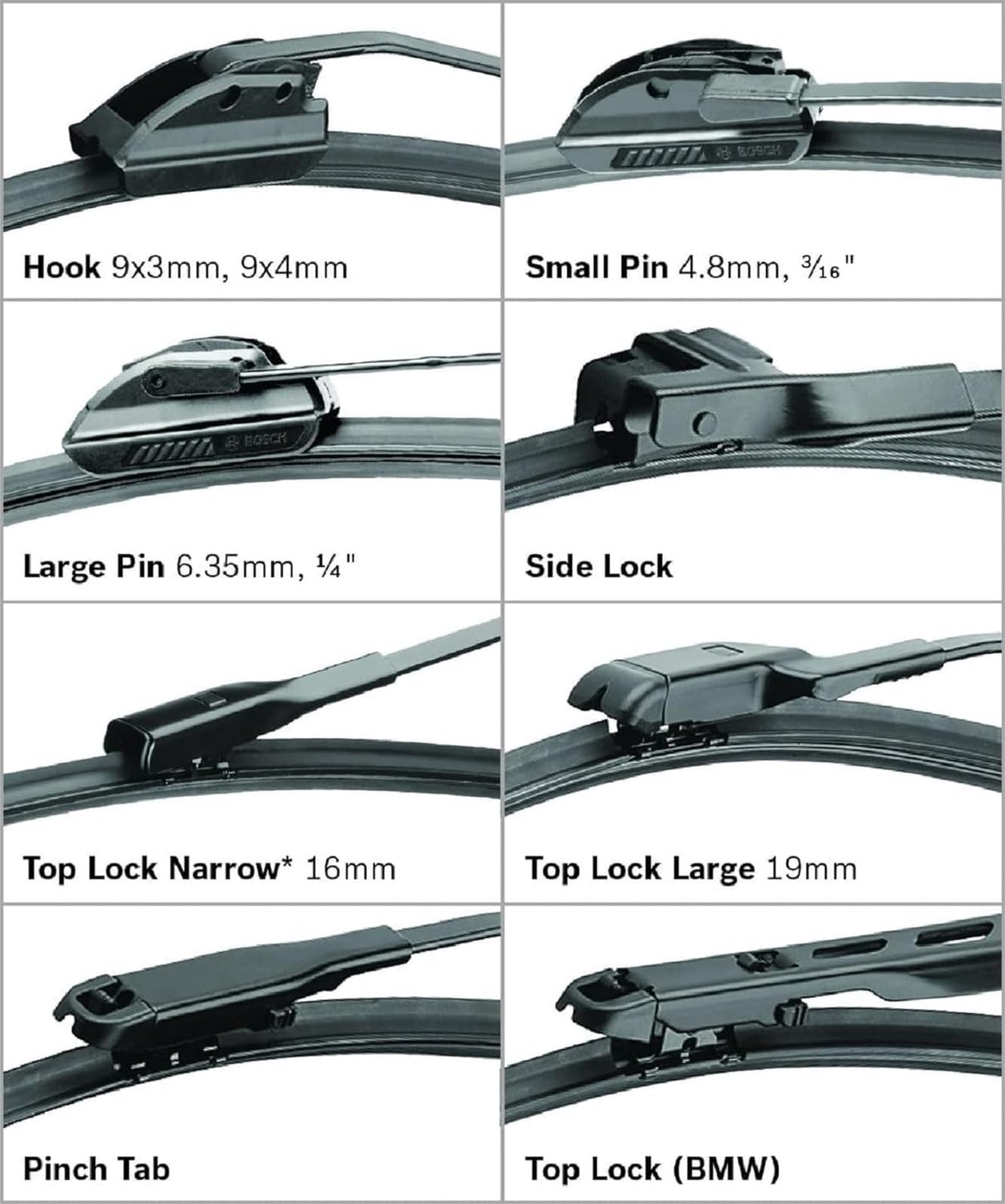 Bosch Clear Advantage Wiper Blades feature a patented beam design that reduces exposed metal for greater resistance to ice and snow build-up for improved all-weather performance. The blended natural rubber blade, with graphite treated wiping edge, reduces friction for a quiet and smooth wipe in all seasons. Clear Advantage wiper blades include an aerodynamic wind spoiler that creates downward force which ensures maximum windshield contact for consistent wiping at higher speeds. The versatile Click-On adapter system - compatible with most vehicles - ensures quick and easy installation. Included adapters fit: 9x3mm Hook, 9x4mm Hook, 4.8mm (3/16 inch) Small Pin, Side Lock, Pinch Tab, 16mm Narrow Top Lock (select lengths only), 19mm Large Top Lock, BMW Top Lock, Denso.