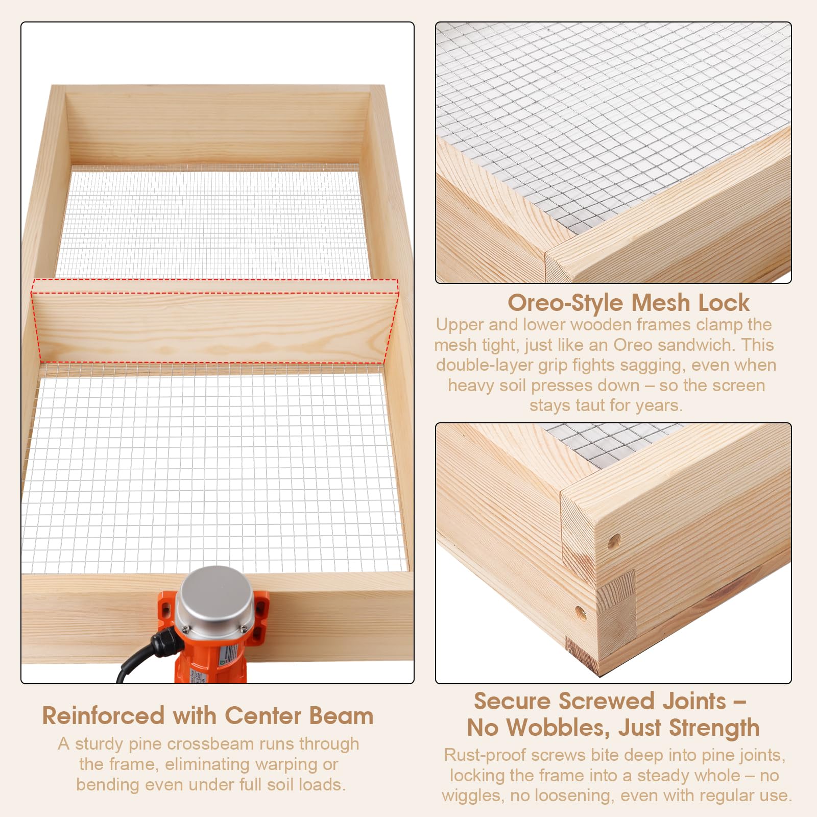 Sturdy Construction for Long-Lasting Performance: Built to withstand heavy use, the sifter features a robust pine wood crossbeam that prevents metal mesh buckling. The frame is crafted from durable, rough-sawn pine lumber with rust-resistant screws, ensuring stability and longevity—even in outdoor conditions.