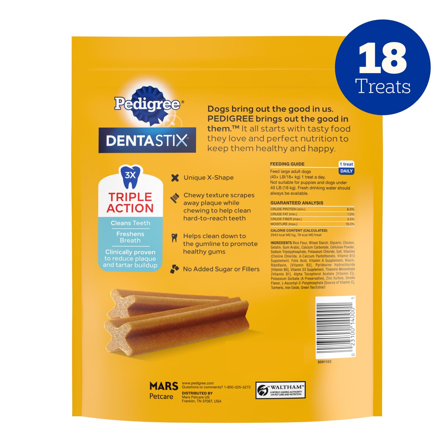 Dogs bring out the good in us. Pedigree brings out the good in them. With Pedigree Dentastix large dog breed dental care treats you can provide your dog with a tasty dental treat and help keep them happy with quality dental care. These dog dental treats are formulated with no added sugar or fillers and can be served once a day to large breed dogs as part of a daily routine at home for everyday dental care. Pedigree Dentastix is designed with a distinctive X-shape and a chewy texture that scrapes away plaque while your dog chews, cleaning hard-to-reach areas around teeth for oral health, dental hygiene, plaque removal, and gum care. With triple action that cleans teeth, freshens breath, and reduces tartar buildup for tartar control and breath freshening, your dog gets a pet treat that helps support dental health, promote oral hygiene, and provide daily dental support for adult dogs, large dogs, and big dogs. This tasty original-flavored treat makes dental care for your large breed dog not only beneficial but also delicious.