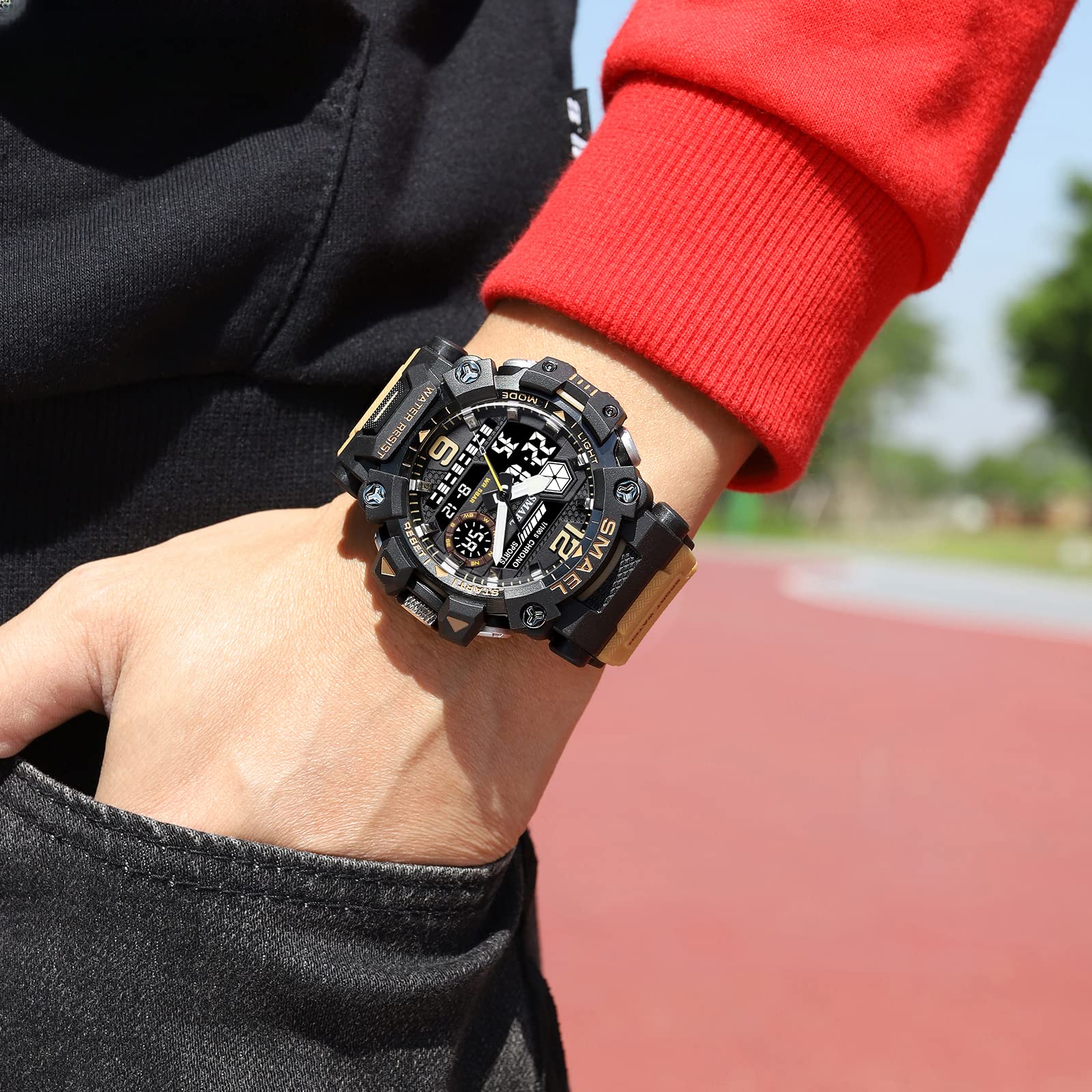 Mens Military Watch: Cool large sporty dial designed, big face diameter (2.12 inch/54mm), Digital and Analog dual displays and mulitifunction watch, fits both outdoor and indoor activities, such as running, hiking and so on, easy to set up after reading the manual