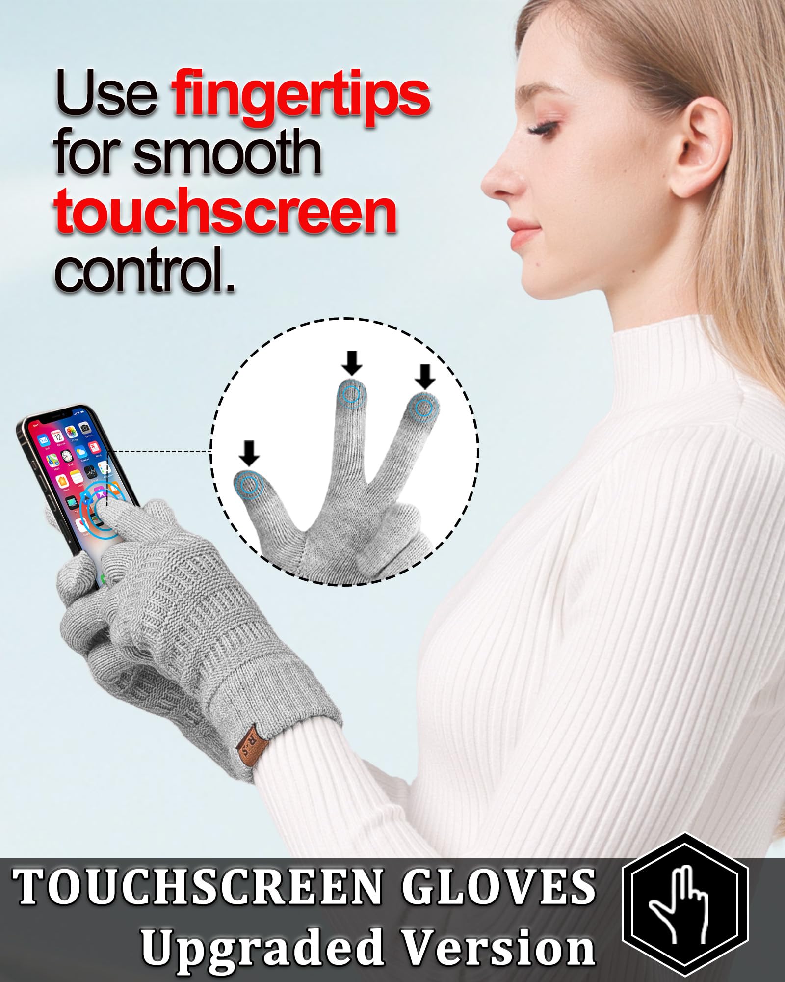 HIGH SENSITIVE TOUCHSCREEN: featuring upgraded touchscreen conductive material on thumbs, forefingers and middle fingers, you can use your smartphone and touchscreen devices without having to remove the touchscreen gloves in cold weather, allows for convenient interaction with devices.