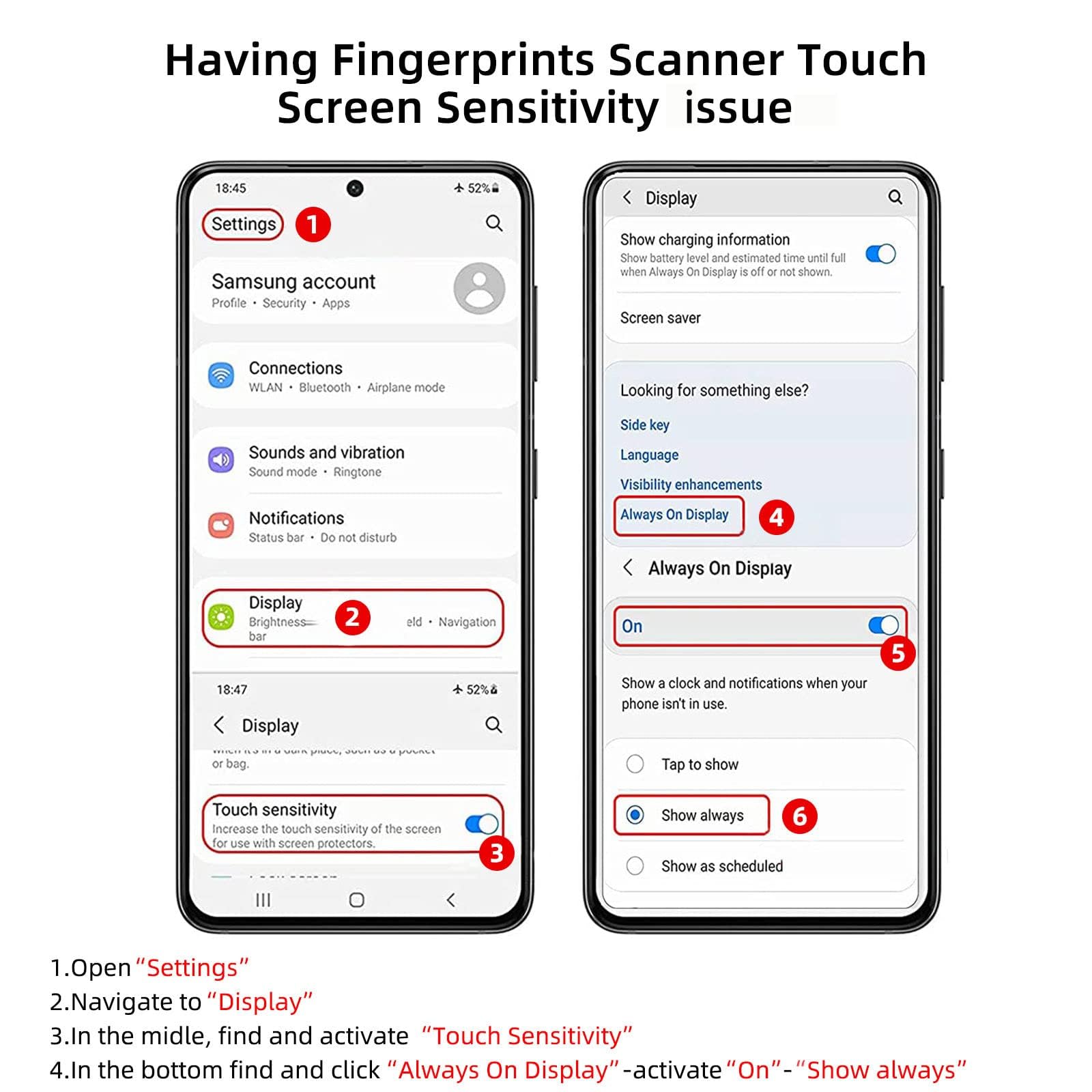 IMPORTANT: Enable: Settings > Display > Increase Touch Sensitivity. At the bottom, Enable Always On Display and Always On Display Delete your fingerprints before installation and save new ones after installation.