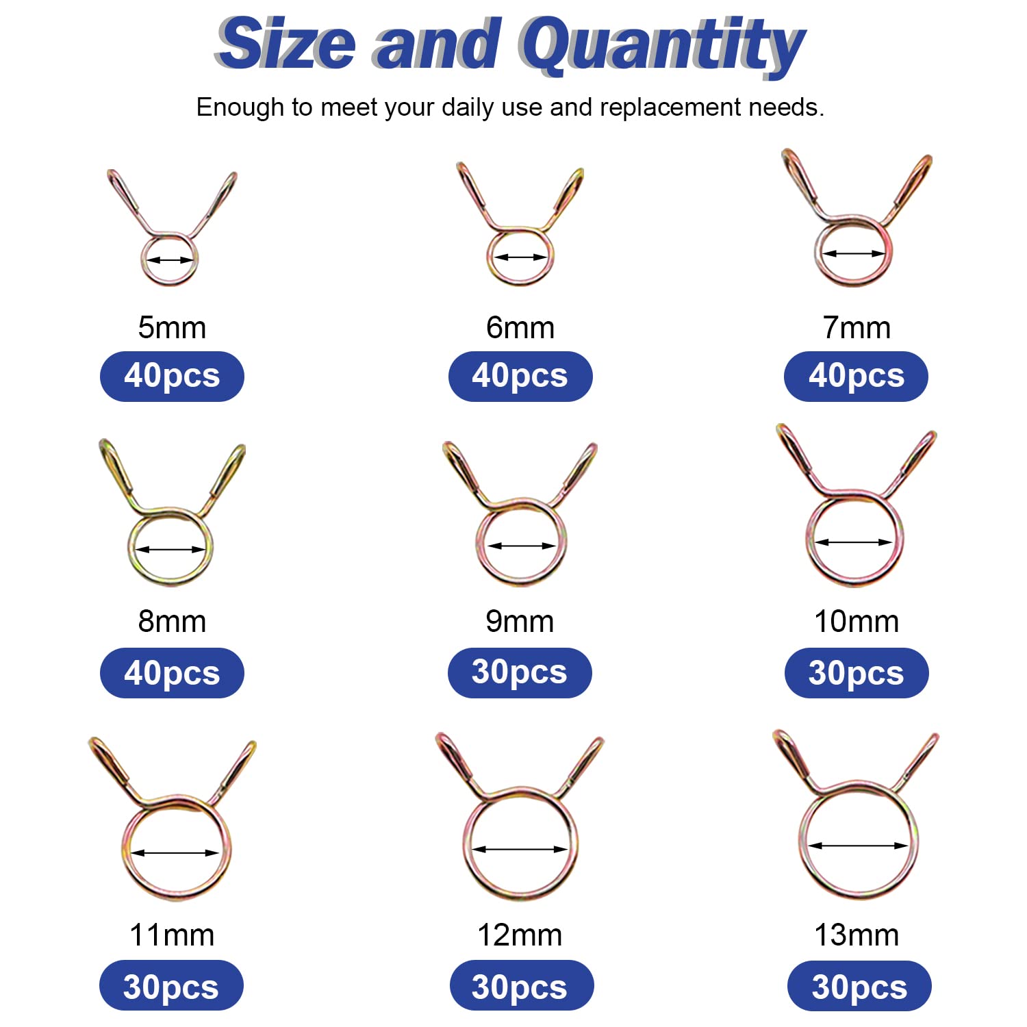 9 sizes of hose clamps-5mm, 6mm, 7mm, 8mm, 9mm, 10mm, 11mm, 12mm and 13mm respectively