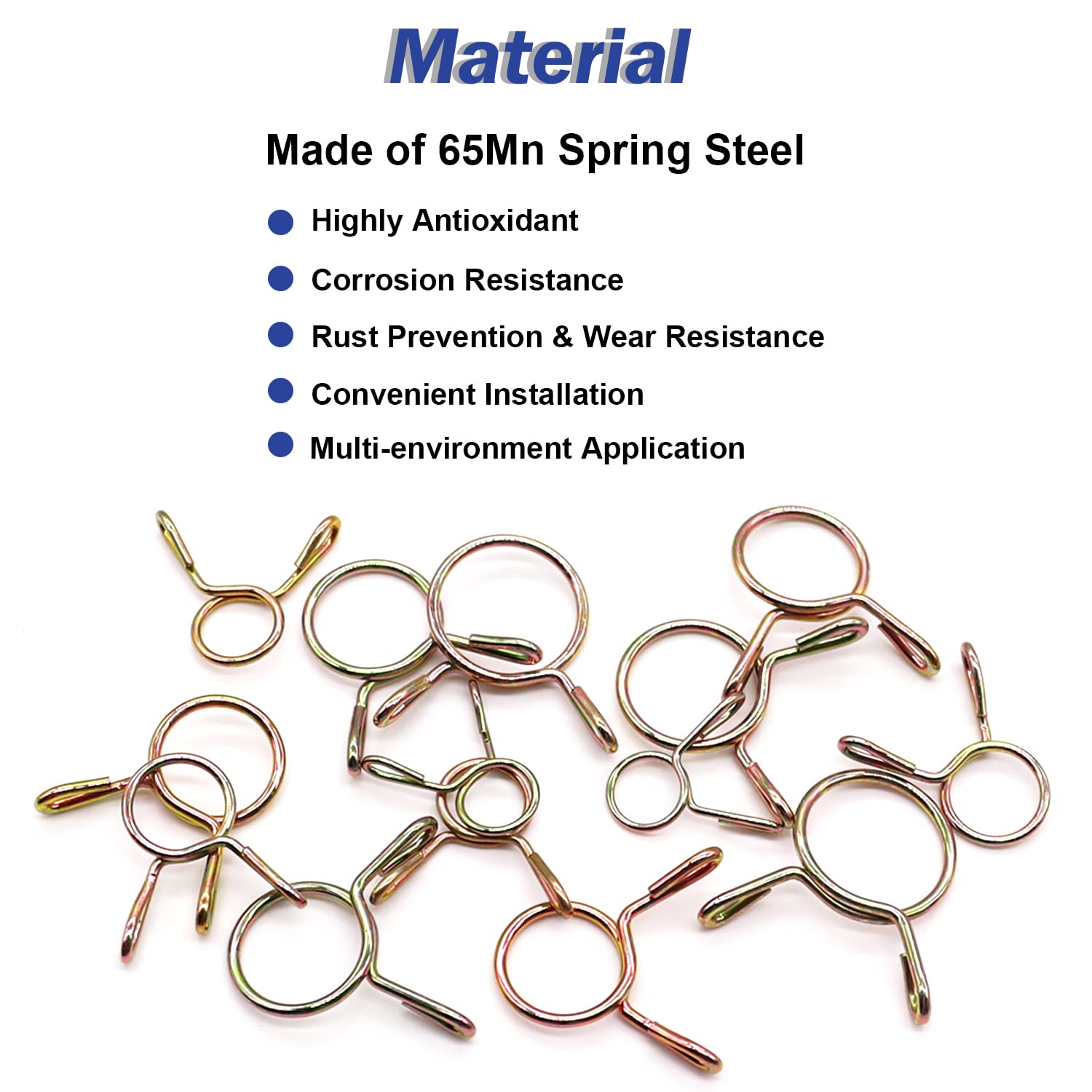 The hose clamps are all made of 65Mn spring steel, with galvanized surface, corrosion resistance, rust resistance, durability and fracture resistance
