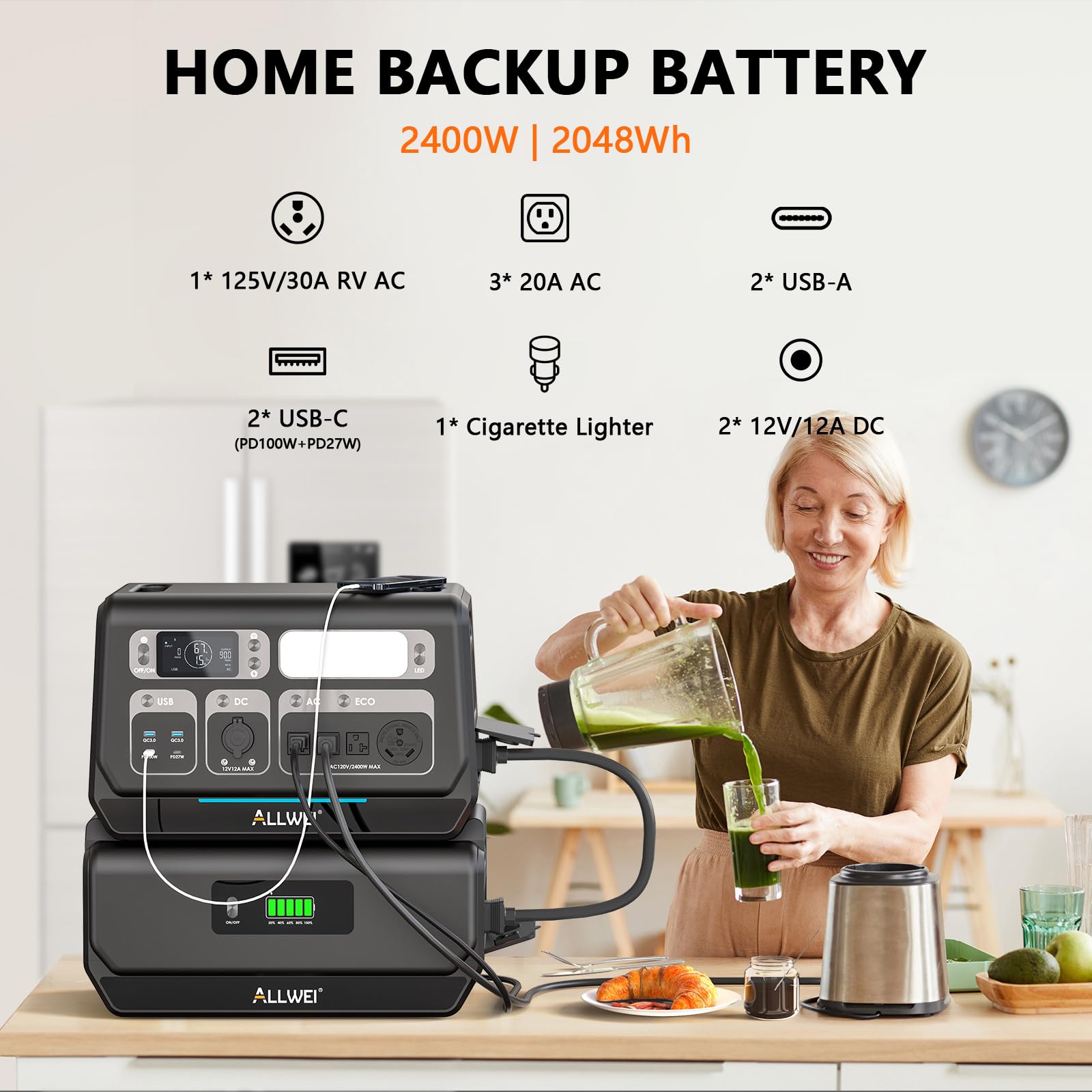 【Expandable from 2kWh to 10kWh】ALLWEI PPS2400-3 with 2048Wh B200 PRO LFP battery. Expand up to 10240Wh with 4x B200 PRO, ensuring uninterruptible power for all your needs during outages. Simultaneous Charge and Discharge.