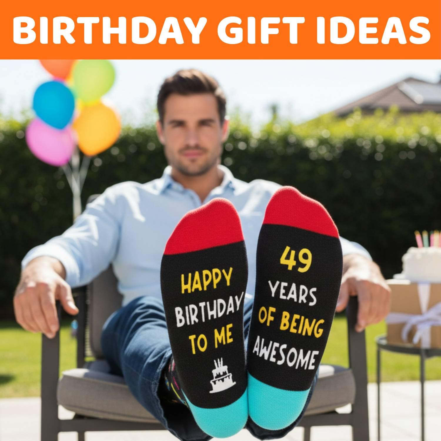 49TH BIRTHDAY GIFTS: These socks feature birthday gifts, balloons, cakes, and other elements on the top, while the bottom features a hilarious secret message written in non-slip ink: "HAPPY BIRTHDAY TO ME, 49 YEARS OF BEING AWESOME"