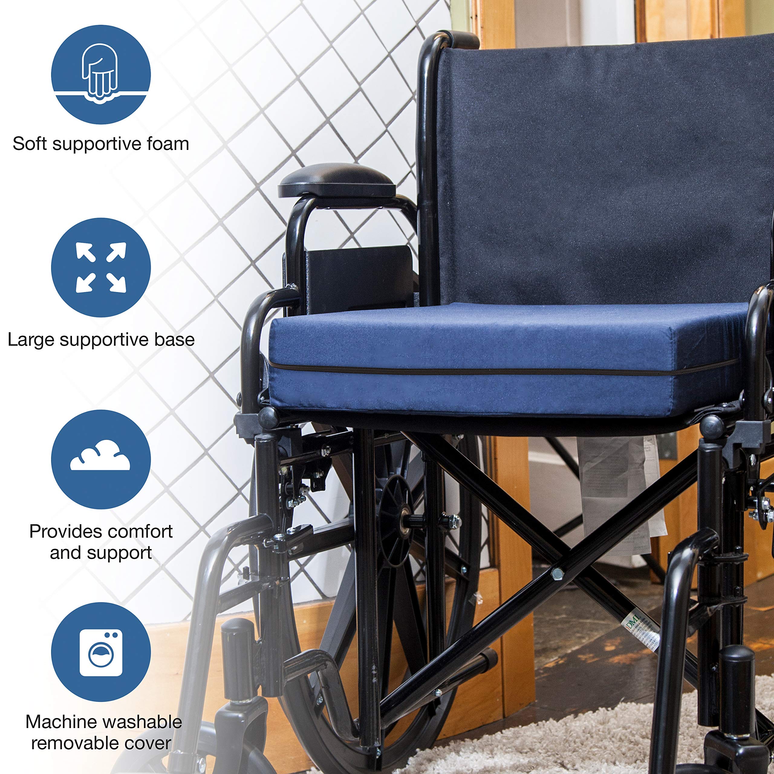 DMI Wheelchair Cushion with Cover. Effortlessly increase your support, comfort, and height in your wheelchair with our DMI Wheelchair Cushion. Our seat cushion is great for wheelchairs, car seats, regular chairs, office chairs, hard benches, and more. Benefits of our cushion include reducing and preventing back stiffness and pain, added comfort to uncomfortable wheelchairs, and the cushion is lightweight and easily portable for travel! Features: Made of lightweight, high density foam that won't crack or crumble, and contains a removable and machine washable cover. Specifications: 4 x 16 x 18 inches, made of poly cotton, navy blue, high density foam.