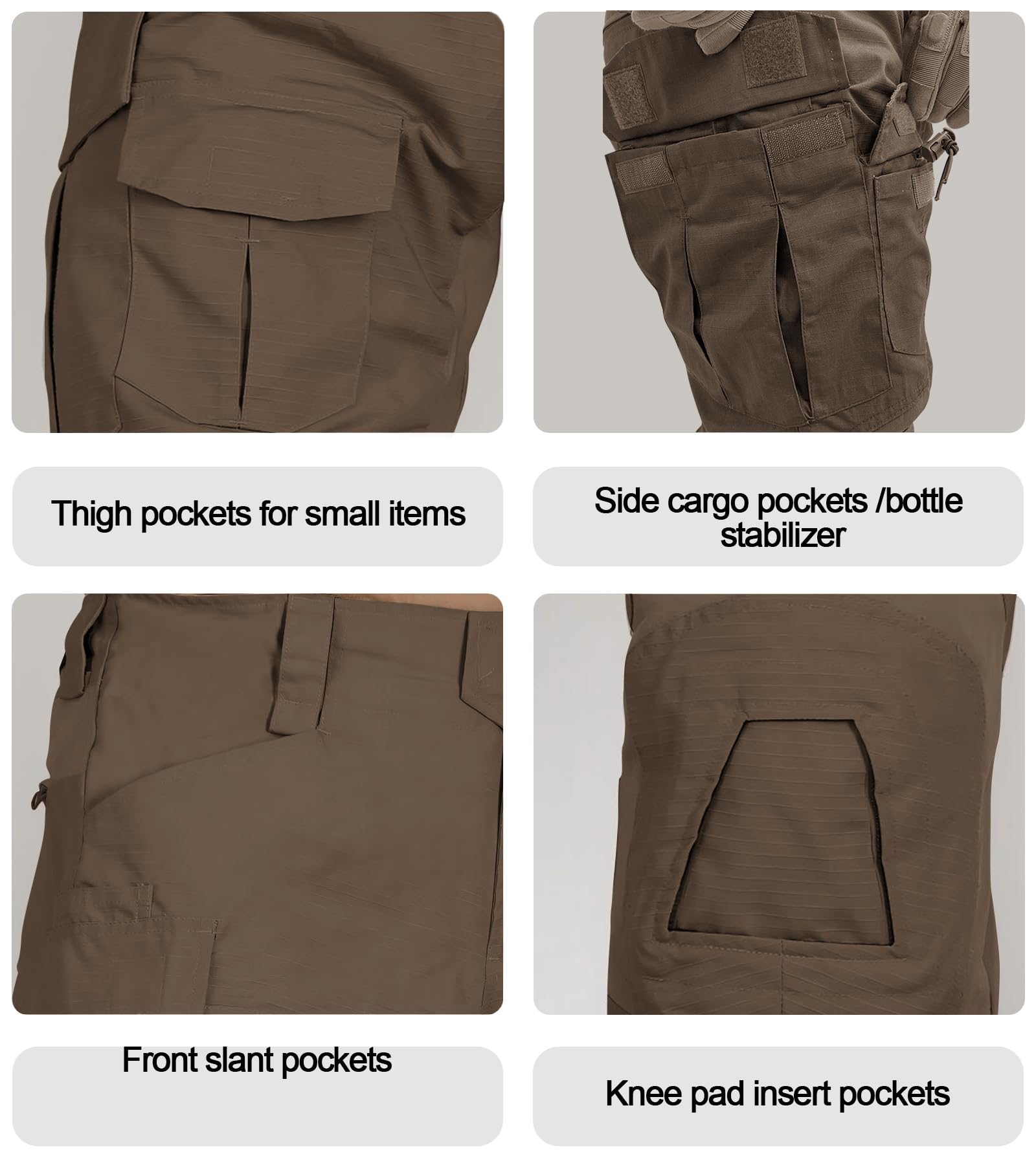 Multi pocket cargo pants for men: The camo pants men are with 10 pockets for tactical tools and self items. Including 2 front slant pockets; 2 thigh pockets; 2 side leg pockets; 2 side calf pockets; 2 zipper rear pockets.There are three hook and loop panels sewn onto the knee pad pockets top and sides which attach to the hook and loop material inside to pant legs which drastically helps prevent the knee pad blowing out