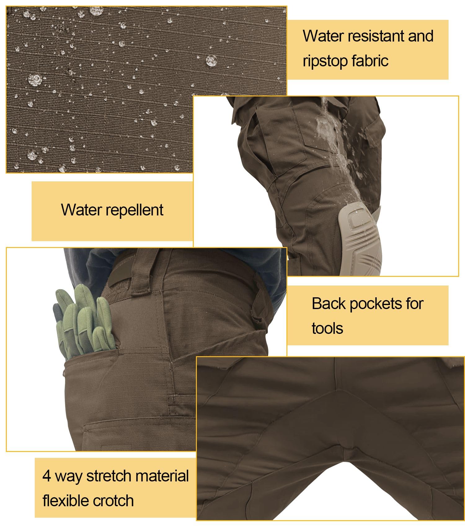 Design for work pants men: Tactical pants for men stretch feature with smooth zipper fly, hook and loop closure, waist adjustable tape and wide belt loops for flexible adjustment . The height of the knee pads can be adjusted by a tension cord at the front pocket.Hiking pants with knee pads for men have tightening straps at the back of the knee area and ankle cuff to dictate how tight you want them to fit in hot or cold weather