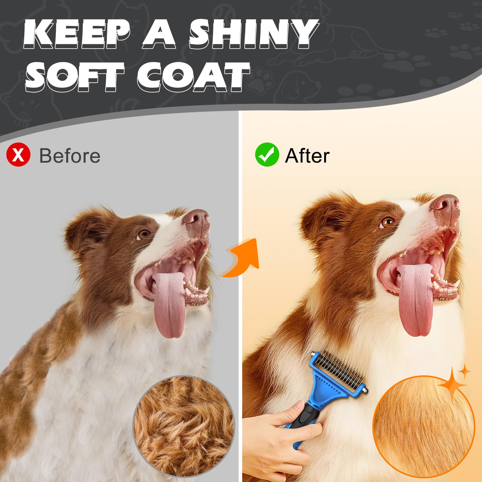 【Undercoat Rake】Our undercoat rake is perfect for de-shedding and de-matting medium to long-haired pets. Featuring a double-sided design, the 9-tooth side can be used for stubborn mats, tangles and knots, while the 17-tooth side can be used to thin and remove loose hair from dogs and cats