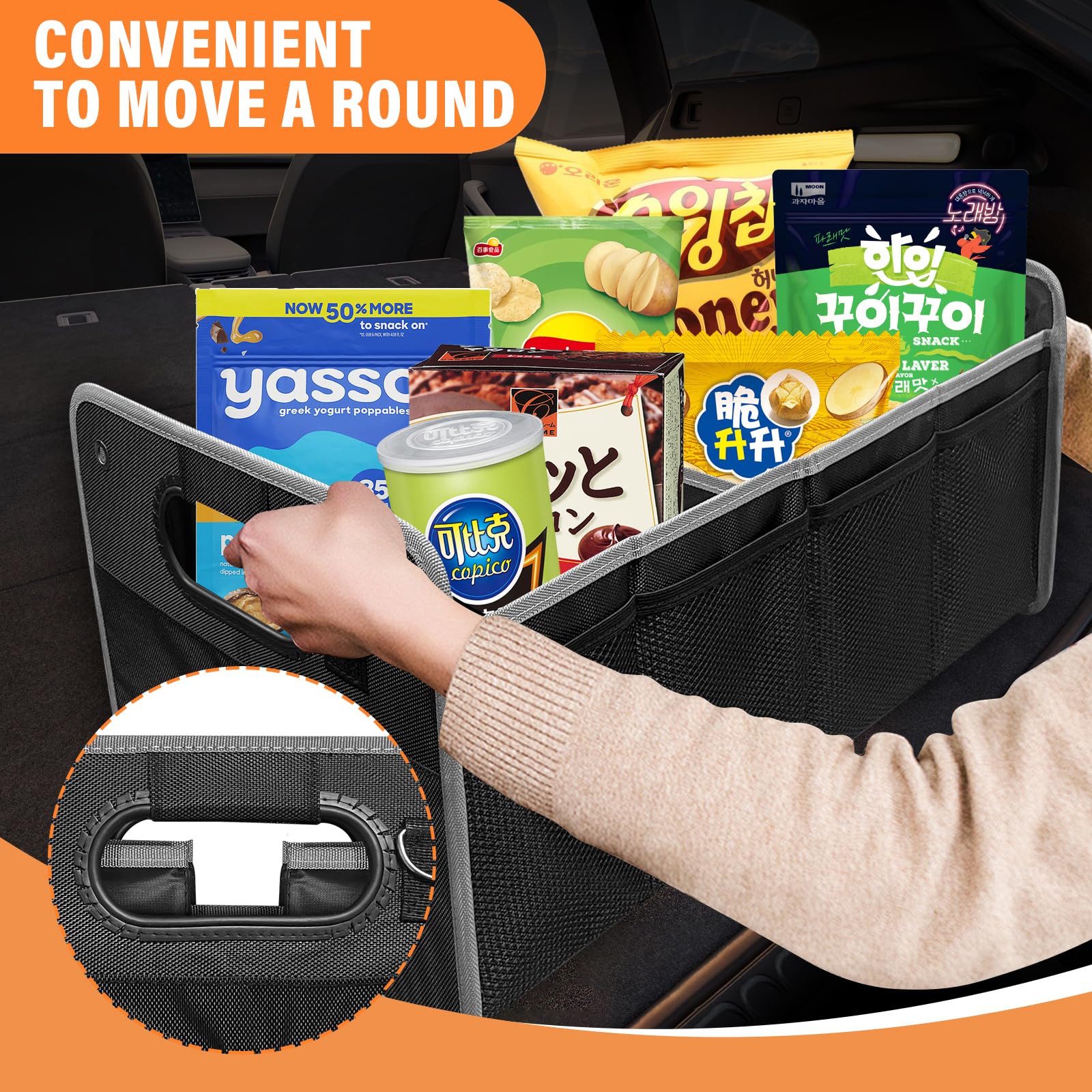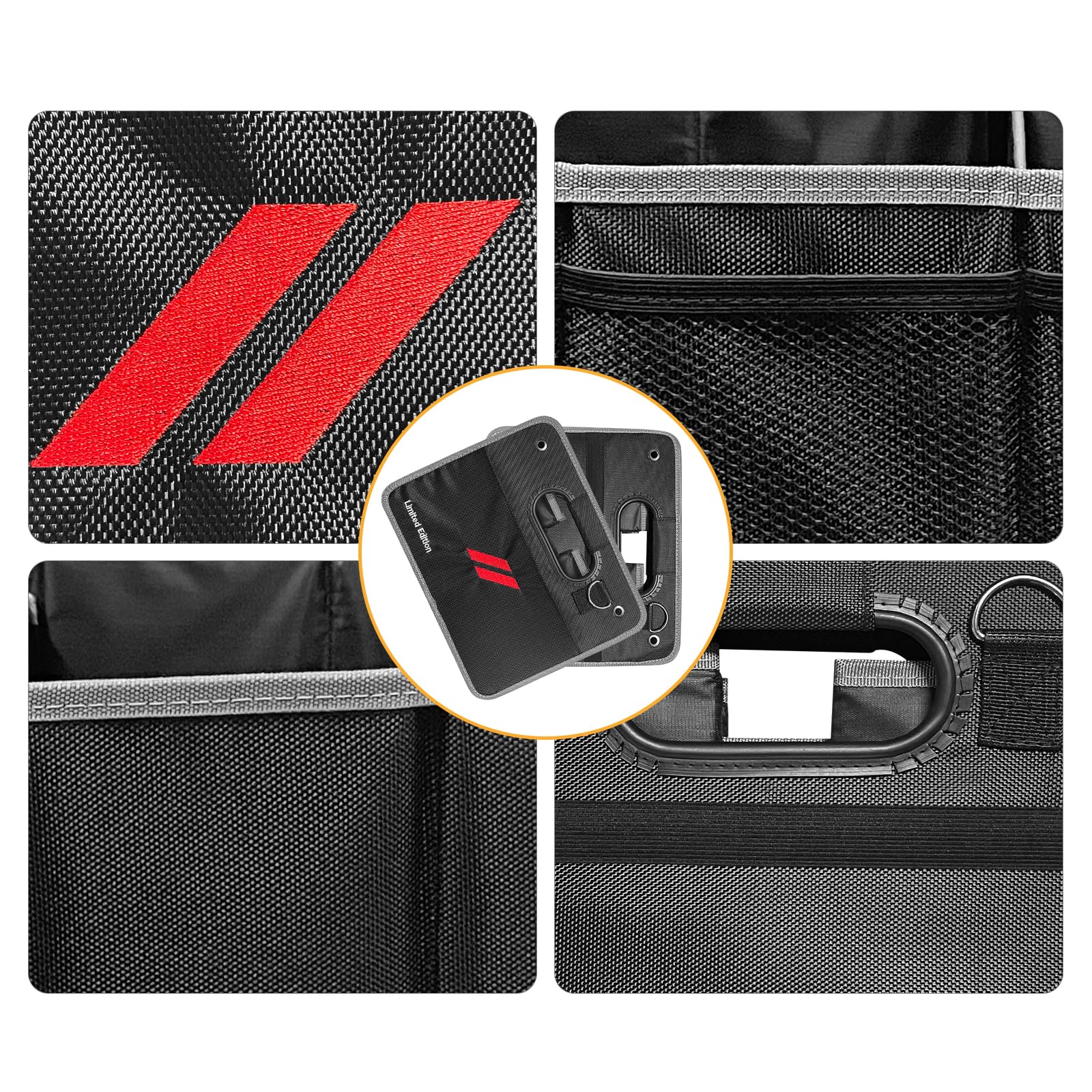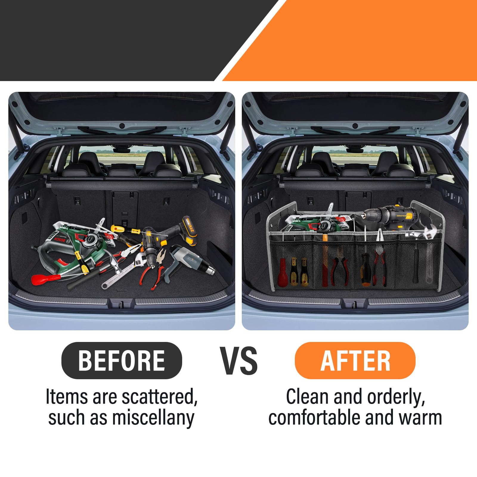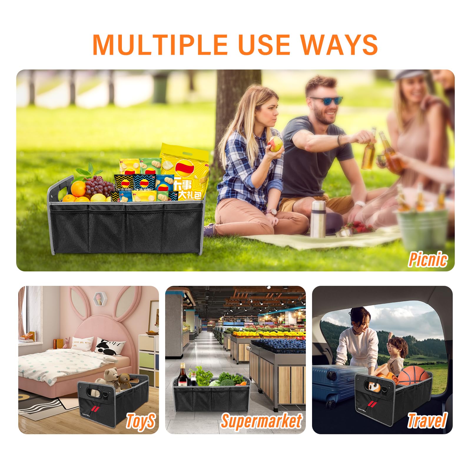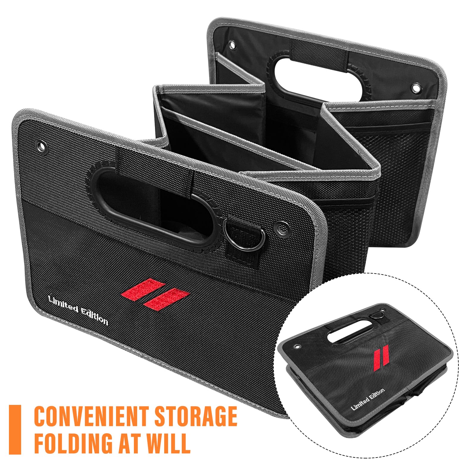 【STURDY MATERIAL】The trunk organizer is made of black fabric with each panel made of high quality 600D Oxford polyester material, reinforced with 2mm cardboard to ensure a strong and safe storage environment
