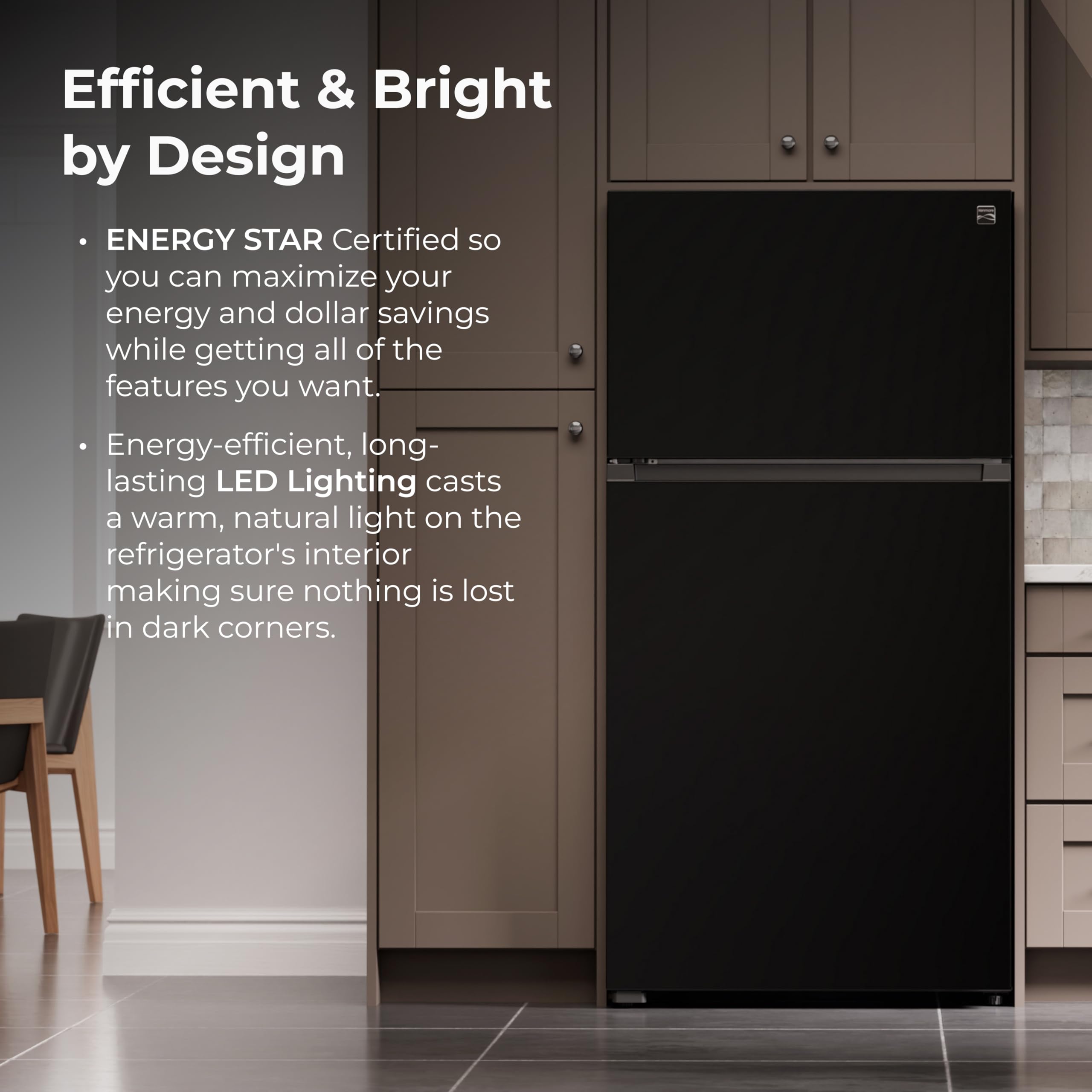 Maximize your kitchen space with the Kenmore 33" Top-Freezer Refrigerator in black. With 20.4 cu. ft. of capacity and a 33-inch-wide footprint, its full capacity size offers plenty of room for fresh and frozen essentials. The standard-depth design lets it stand proud while storing party trays, groceries, and everything in between. Full-width, adjustable glass shelves give you the flexibility to store wide or tall items with ease. Three clear door bins hold gallon jugs, condiments, and dressings, while two clear freezer door bins help keep smaller items organized. Humidity-controlled crispers keep produce fresher, longer, and the dedicated dairy compartment stores butter and spreads at just the right temperature. Long-lasting LED lighting casts natural light throughout the fridge so nothing gets lost in the back. The recessed pocket handle and flush-front design add a modern, easy-to-clean look that complements any kitchen style. ENERGY STAR certified for efficiency, and compatible with a factory installed icemaker that produces up to 3 pounds of crescent-shaped ice per day, this refrigerator is a smart, stylish solution for any home.