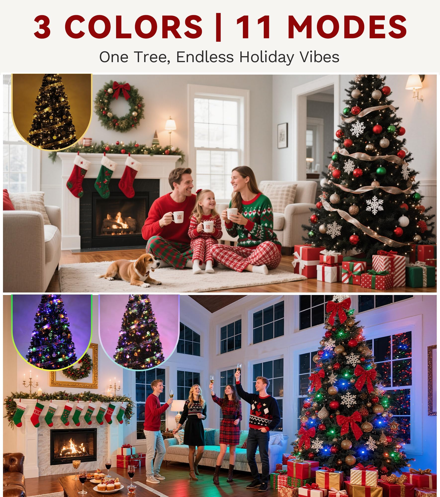 2 Colors with 11 Modes: This halloween christmas tree prelit has both mysterious warm string lights and fashionable coloured string lights, and has 11 different flickering modes, including constant light, gradient, flickering, etc., which can be switched freely to create different atmospheres