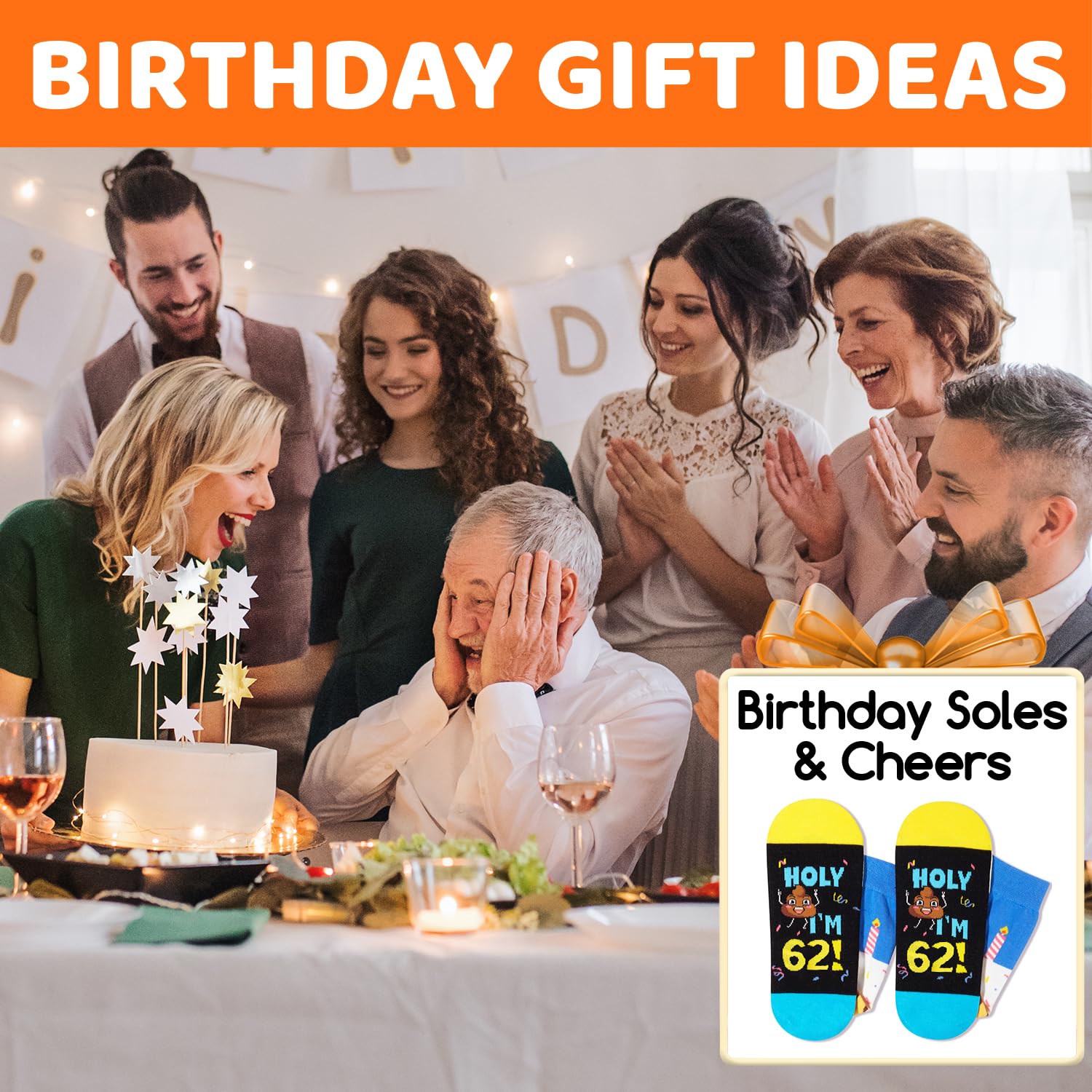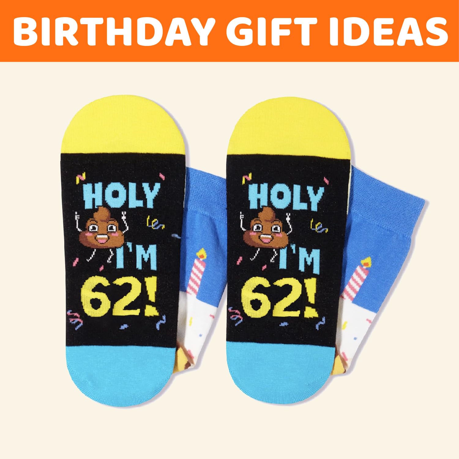 62nd BIRTHDAY GIFT IDEAS: These socks feature a cake and candle design on top, while the bottom is sewn with a fun message: "HOLY, I'M 62!". They are suitable for any holiday gifts, such as Birthday gifts, Christmas gifts, or White Elephant gifts.