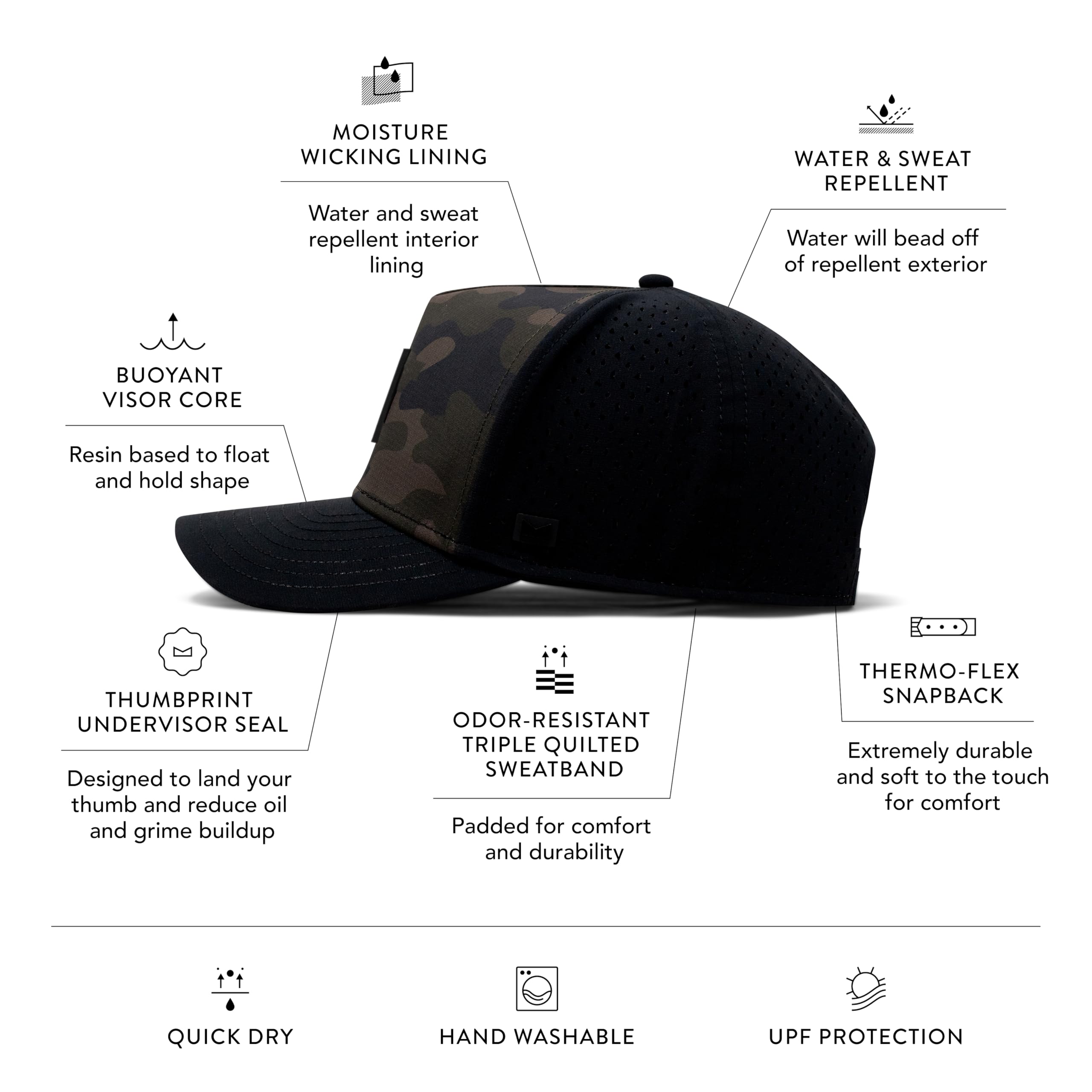 PERFORMANCE SNAPBACK HAT: Exterior crown has hydrophobic crown panels, laser-perforated side & rear panels for breathability, and custom soft touch snapback closure. Honeycomb Visor is designed for weight reduction and packability
