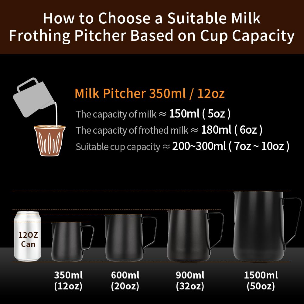 Please note: The maximum capacity of this pitcher is 12oz/350ml with a scale range of 4oz-11oz (120-330ml).We recommend that the first use add no more than half the capacity of the container for the milk frothing to prevent spraying.