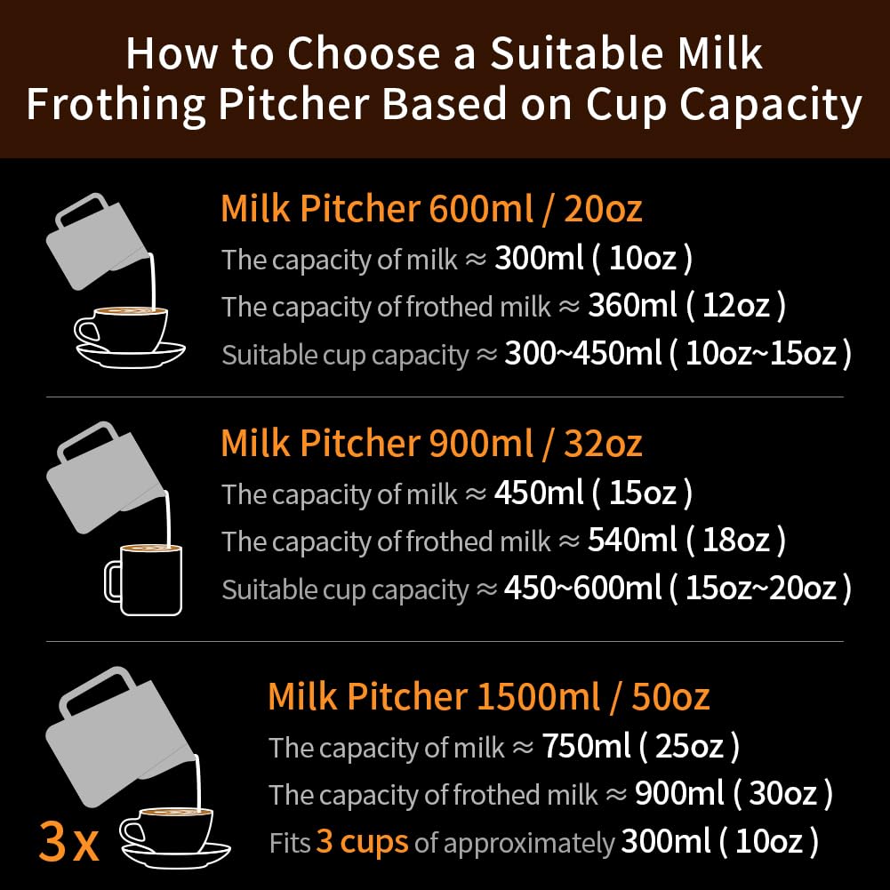 Inside Scale Lines: The clear internal measurement lines (ml/oz) make it easy to control the amount of milk or cream per cup of coffee. Available in 12oz and 20oz sizes to meet different needs. Ideal for foaming or steaming milk for espresso and cappuccinos, and versatile for measuring other liquids like water, juices, batter mixes, smoothies, etc.
