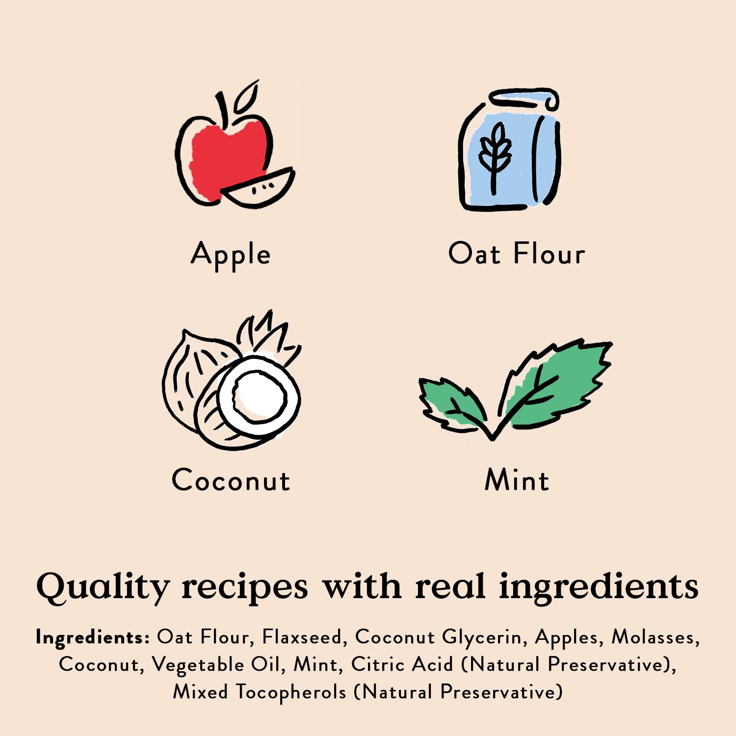 We are not the only ones in need of some daily TLC. Let's keep your pup feeling not a day over one, and extra fresh for those sloppy 'welcome home' smooches. Ingredients: Oat Flour, Flaxseed, Coconut Glycerin, Apples, Molasses, Coconut, Vegetable Oil, Mint, Citric Acid [Natural Preservative], Mixed Tocopherols [Natural Preservative]; Guaranteed Analysis: Protein: 12% Fat: 4% Fiber: 2% Moisture: 20%; Calories: 9 cal/treat