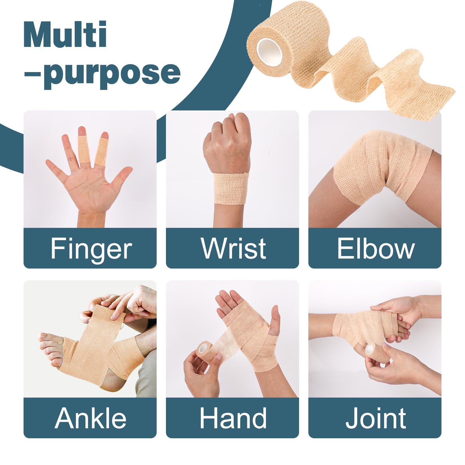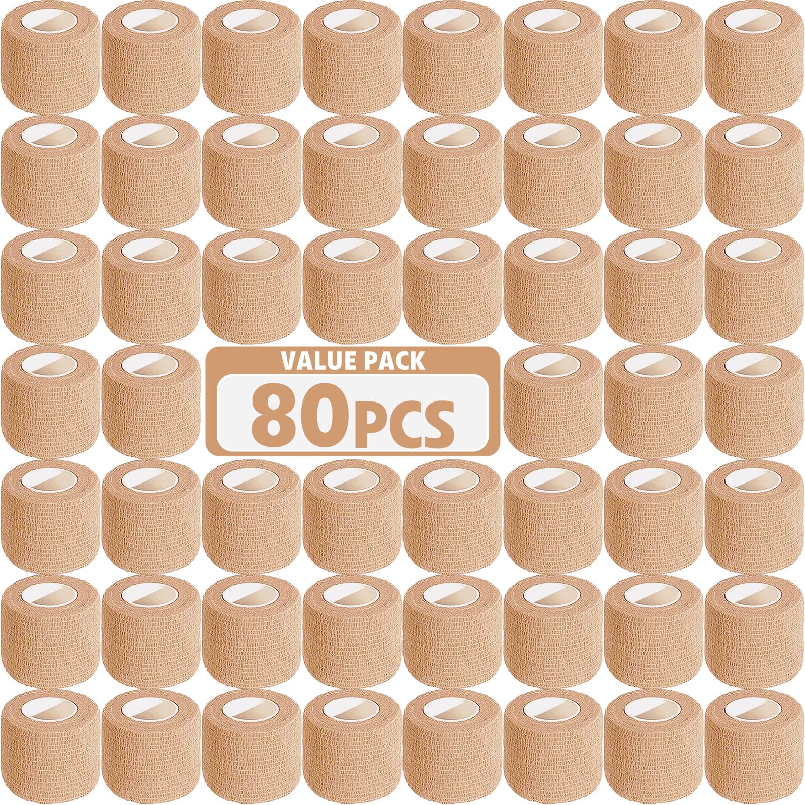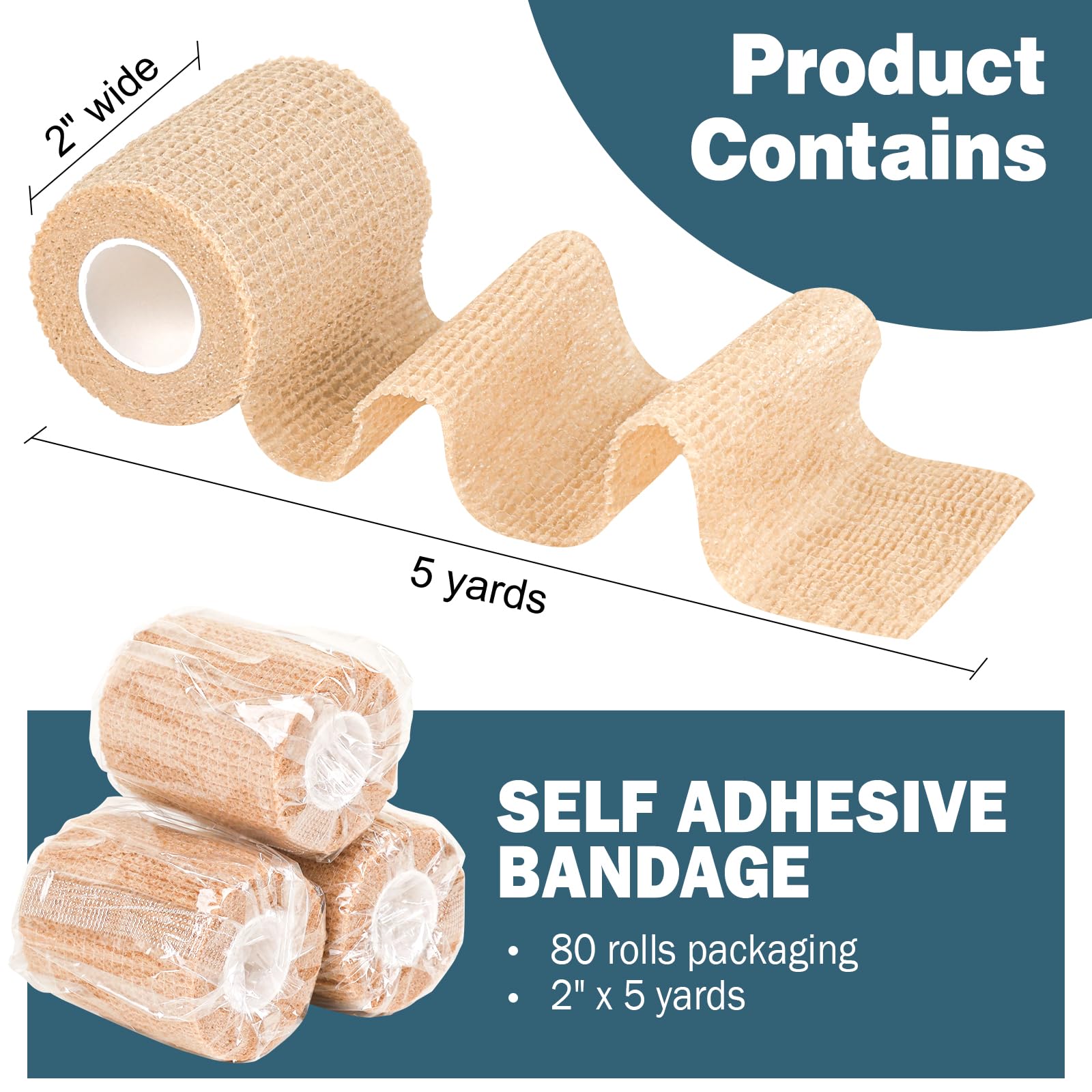 Self Adhesive Bandage: Package includes 80 rolls of skin color self adhesive bandage wrap. Each roll measures 2 inch wide and 5 yards long after stretching. It easily adheres to itself but will not stick to other surfaces such as skin or hair, making it easy to pull off and change bandages